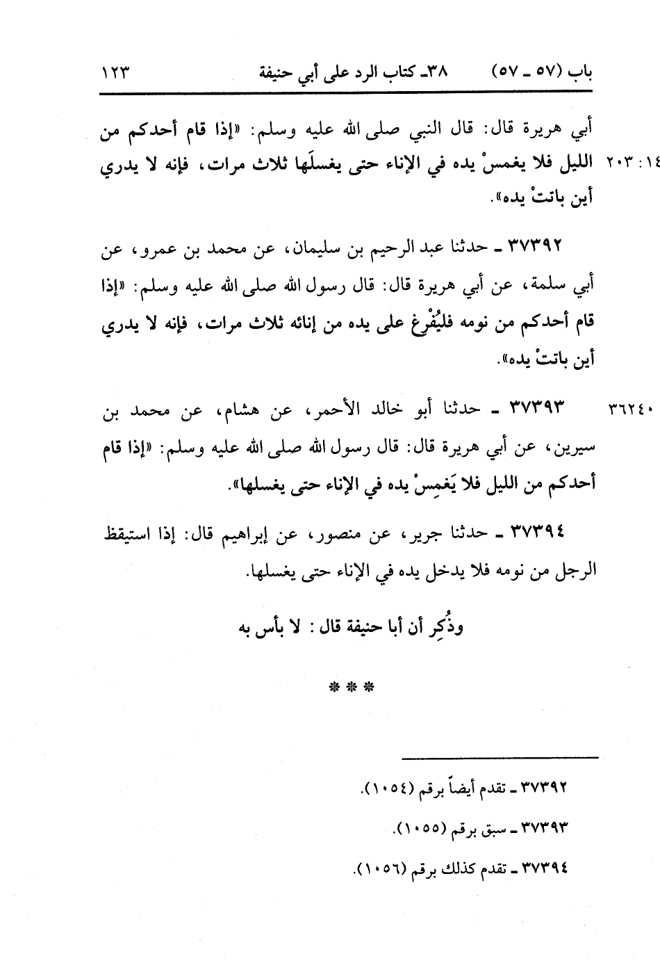 37393- حَدَّثَنَا أَبُو خَالِدٍ الأَحْمَرُ ، عَنْ هِشَامٍ ، عَنْ مُحَمَّدِ بْنِ سِيرِينَ ، عَنْ أَبِي هُرَيْرَةَ ، قَالَ : قَالَ رَسُولُ اللهِ صَلَّى الله عَلَيْهِ وَسَلَّمَ : إِذَا قَامَ أَحَدُكُمْ مِنَ اللَّيْلِ فَلاَ يَغْمِسْ يَدَهُ فِي الإِنَاءِ حَتَّى يَغْسِلَهَا.
