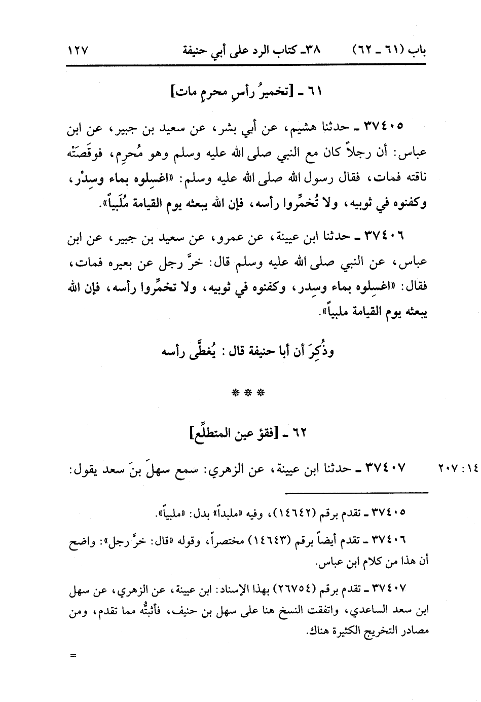 37406- حَدَّثَنَا ابْنُ عُيَيْنَةَ ، عَنْ عَمْرٍو ، عَنْ سَعِيدِ بْنِ جُبَيْرٍ ، عَنِ ابْنِ عَبَّاسٍ ، عَنِ النَّبِيِّ صَلَّى الله عَلَيْهِ وَسَلَّمَ ، قَالَ (1): خَرَّ رَجُلٌ عَنْ بَعِيرِهِ فَمَاتَ ، فَقَالَ : اغْسِلُوهُ بِمَاءٍ وَسِدْرٍ ، وَكَفِّنُوهُ فِي ثَوْبَيْهِ ، وَلاَ تُخَمِّرُوا رَأْسَهُ ، فَإِنَّ اللَّهَ يَبْعَثُهُ يَوْمَ الْقِيَامَةِ مُلَبِّيًا.