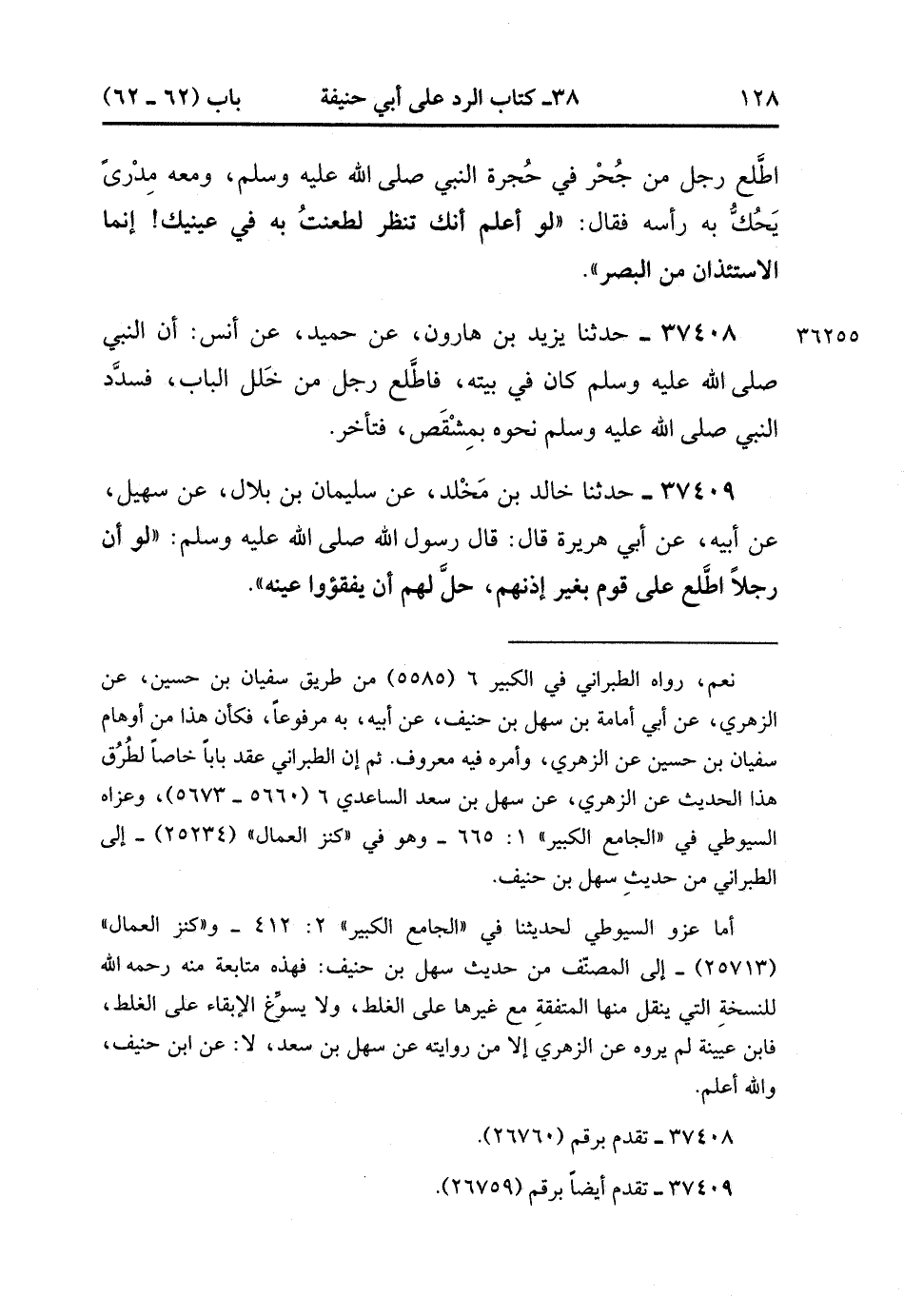 37407- حَدَّثَنَا ابْنُ عُيَيْنَةَ ، عَنِ الزُّهْرِيِّ ، سَمِعَ سَهْلَ بْنَ سَعْدٍ ، يَقُولُ : اطَّلَعَ رَجُلٌ مِنْ جُحْرٍ فِي حُجْرَةِ النَّبِيِّ صَلَّى الله عَلَيْهِ وَسَلَّمَ وَمَعَهُ مِدْرًى يَحُكُّ بِهِ رَأْسَهُ ، فَقَالَ : لَوْ أَعْلَمُ أَنَّك تَنْظُرُ لَطَعَنْتُ بِهِ فِي عَيْنَيْك ، إِنَّمَا الاِسْتِئْذَانُ مِنَ الْبَصَرِ.