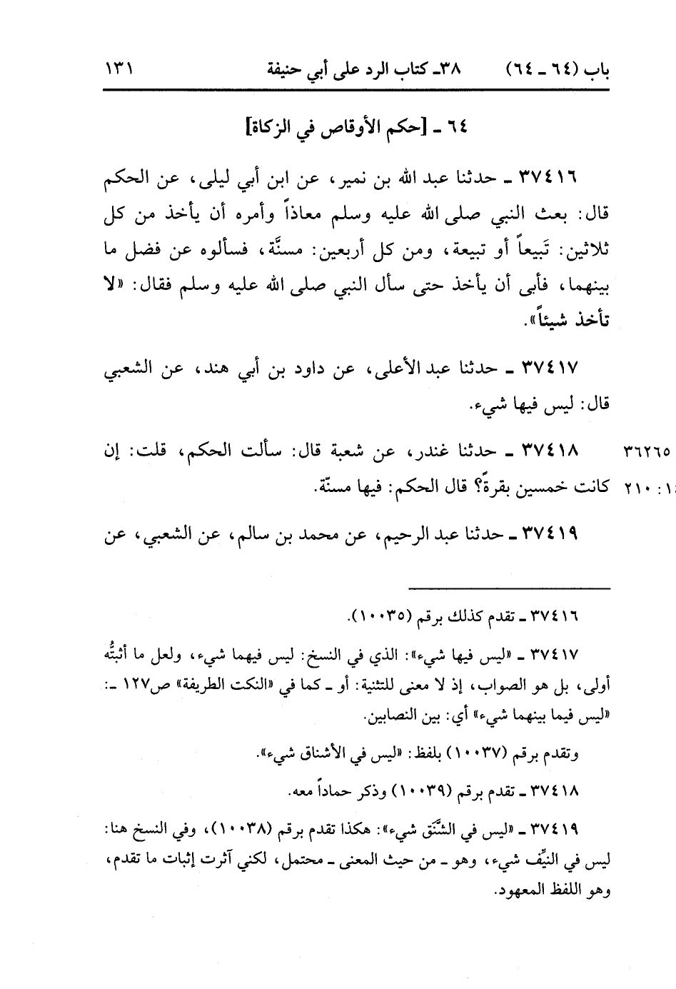 37416- حَدَّثَنَا عَبْدُ اللهِ بْنُ نُمَيْرٍ ، عَنِ ابْنِ أَبِي لَيْلَى ، عَنِ الْحَكَمِ ، قَالَ : بَعَثَ النَّبِيُّ صَلَّى الله عَلَيْهِ وَسَلَّمَ مُعَاذًا ، وَأَمَرَهُ أَنْ يَأْخُذَ مِنْ كُلِّ ثَلاَثِينَ تَبِيعًا ، أَوْ تَبِيعَةً ، وَمِنْ كُلِّ أَرْبَعِينَ مُسِنَّةً ، فَسَأَلُوهُ عَنْ فَضْلِ مَا بَيْنَهُمَا ، فَأَبَى أَنْ يَأْخُذَ حَتَّى سَأَلَ النَّبِيَّ صَلَّى الله عَلَيْهِ وَسَلَّمَ ، فَقَالَ : لاَ تَأْخُذْ شَيْئًا.