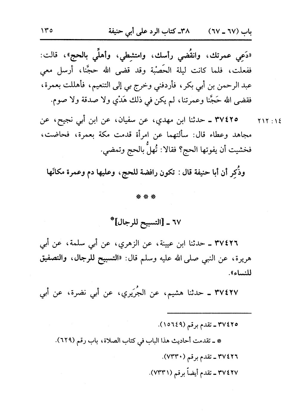 37426- حَدَّثَنَا ابْنُ عُيَيْنَةَ ، عَنِ الزُّهْرِيِّ ، عَنْ أَبِي سَلَمَةَ ، عَنْ أَبِي هُرَيْرَةَ ، عَنِ النَّبِيِّ صَلَّى الله عَلَيْهِ وَسَلَّمَ ، قَالَ : التَّسْبِيحُ لِلرِّجَالِ ، وَالتَّصْفِيقُ لِلنِّسَاءِ.