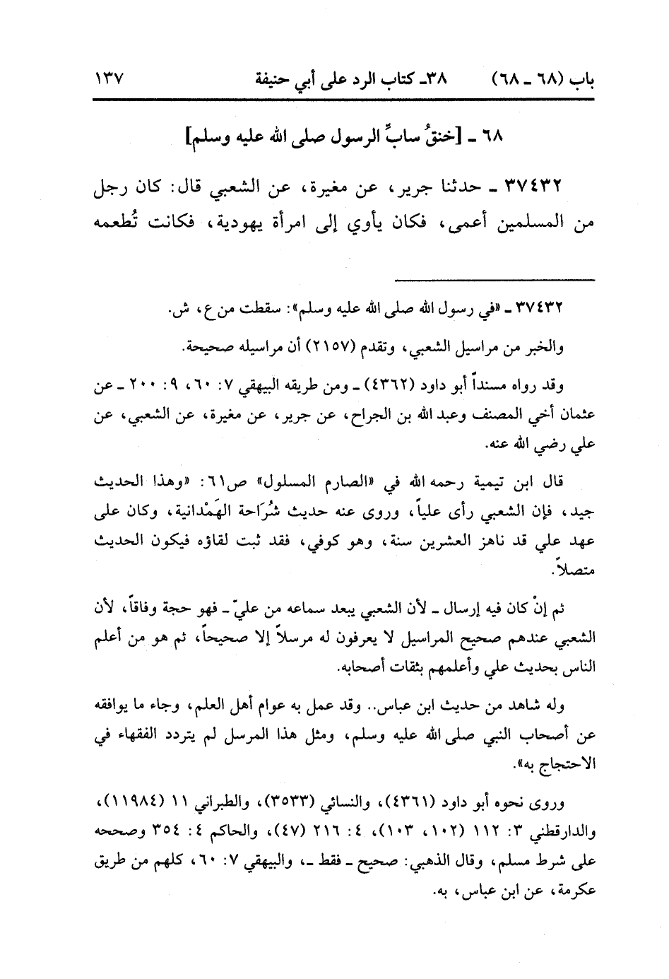 37432- حَدَّثَنَا جَرِيرٌ ، عَنْ مُغِيرَةَ ، عَنِ الشَّعْبِيِّ ، قَالَ : كَانَ رَجُلٌ مِنَ الْمُسْلِمِينَ أَعْمَى ، فَكَانَ يَأْوِي إِلَى امْرَأَةٍ يَهُودِيَّةٍ ، فَكَانَتْ تُطْعِمُهُ ، وَتَسْقِيهِ ، وَتُحْسِنُ إِلَيْهِ ، وَكَانَتْ لاَ تَزَالُ تُؤْذِيهِ فِي رَسُولِ اللهِ صَلَّى الله عَلَيْهِ وَسَلَّمَ ، فَلَمَّا سَمِعَ ذَلِكَ مِنْهَا لَيْلَةً مِنَ اللَّيَالِيِ ، قَامَ فَخَنَقَهَا حَتَّى قَتَلَهَا ، فَرُفِعَ ذَلِكَ إِلَى النَّبِيِّ صَلَّى الله عَلَيْهِ وَسَلَّمَ ، فَنَشَدَ النَّاسَ فِي أَمْرِهَا ، فَقَامَ الرَّجُلُ ، فَأَخْبَرَ أَنَّهَا كَانَتْ تُؤْذِيهِ فِي النَّبِيِّ صَلَّى الله عَلَيْهِ وَسَلَّمَ ، وَتَسُبُّهُ وَتَقَعُ فِيهِ ، فَقَتَلَهَا لِذَلِكَ ، فَأَبْطَلَ النَّبِيُّ صَلَّى الله عَلَيْهِ وَسَلَّمَ دَمَهَا. (14/213).