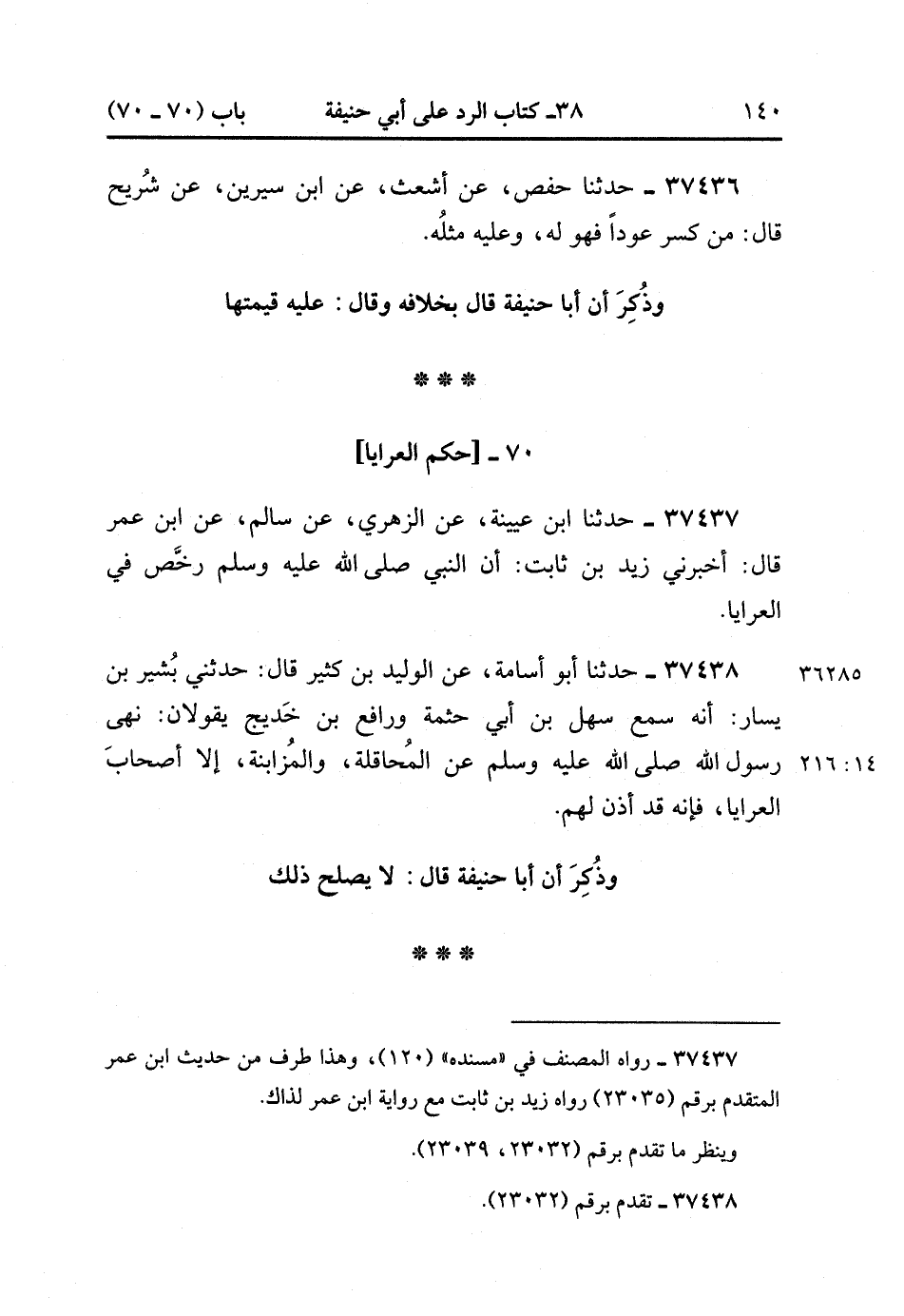 37437- حَدَّثَنَا ابْنُ عُيَيْنَةَ ، عَنِ الزُّهْرِيِّ ، عَنْ سَالِمٍ ، عَنِ ابْنِ عُمَرَ ، قَالَ : أَخْبَرَنِي زَيْدُ بْنُ ثَابِتٍ ؛ أَنَّ النَّبِيَّ صَلَّى الله عَلَيْهِ وَسَلَّمَ رَخَّصَ فِي الْعَرَايَا.