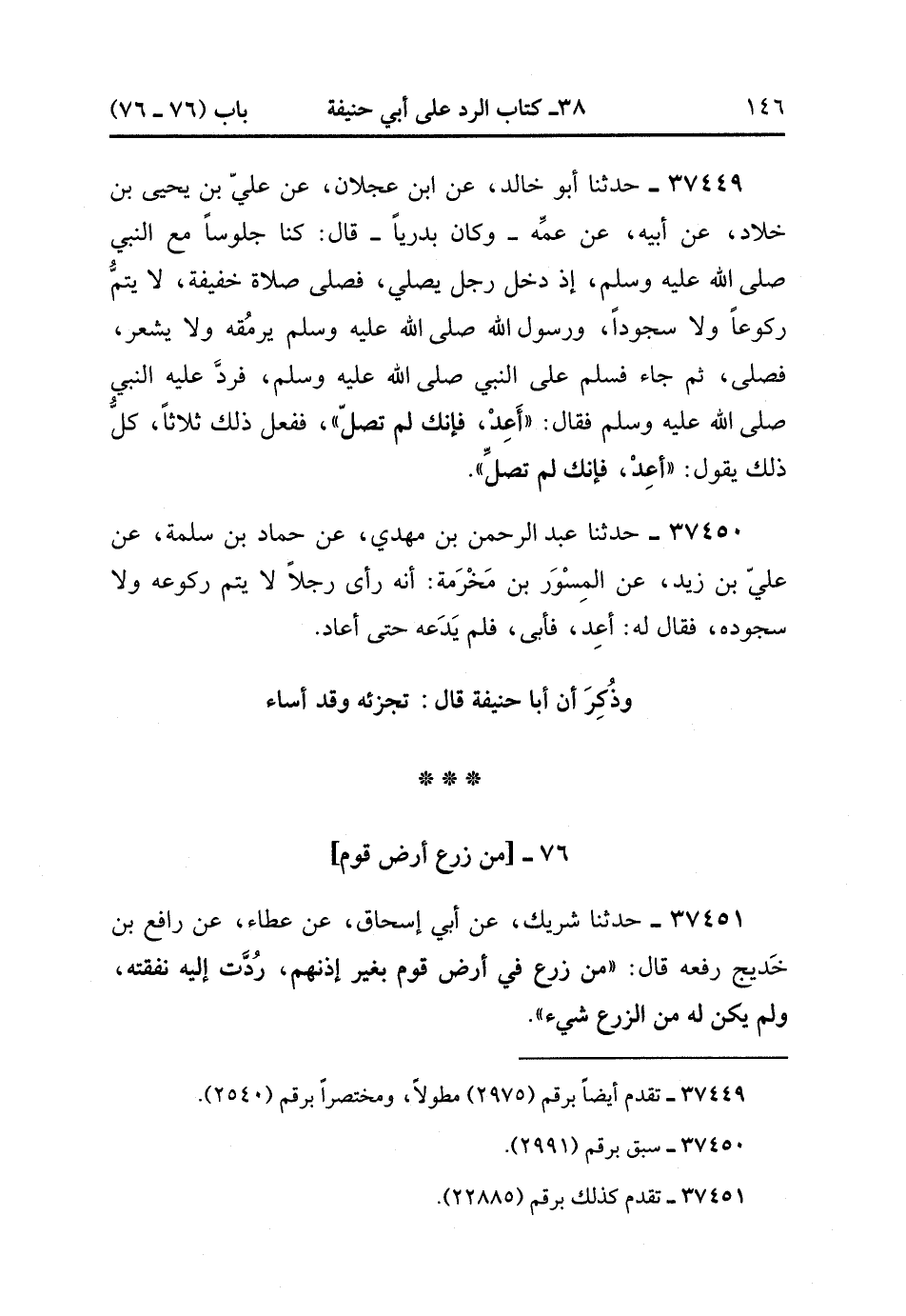 37449- حَدَّثَنَا أَبُو خَالِدٍ ، عَنِ ابْنِ عَجْلاَنَ ، عَنْ عَلِيِّ بْنِ يَحْيَى بْنِ خَلاَّدٍ ، عَنْ أَبِيهِ ، عَنْ عَمِّهِ ، وَكَانَ بَدْرِيًّا ، قَالَ : كُنَّا جُلُوسًا مَعَ النَّبِيِّ صَلَّى الله عَلَيْهِ وَسَلَّمَ ، إِذْ دَخَلَ رَجُلٌ يُصَلِّي ، فَصَلَّى صَلاَةً خَفِيفَةً ، لاَ يُتِمُّ رُكُوعًا ، وَلاَ سُجُودًا ، وَرَسُولُ اللهِ صَلَّى الله عَلَيْهِ وَسَلَّمَ يَرْمُقُهُ وَلاَ يَشْعُرُ ، فَصَلَّى ، ثُمَّ جَاءَ فَسَلَّمَ عَلَى النَّبِيِّ صَلَّى الله عَلَيْهِ وَسَلَّمَ ، فَرَدَّ عَلَيْهِ النَّبِيُّ صَلَّى الله عَلَيْهِ وَسَلَّمَ ، فَقَالَ : أَعِدْ ، فَإِنَّك لَمْ تُصَلِ ، فَفَعَلَ ذَلِكَ ثَلاَثًا ، كُلُّ ذَلِكَ يَقُولُ : أَعِدْ فَإِنَّك لَمْ تُصَلِّ.