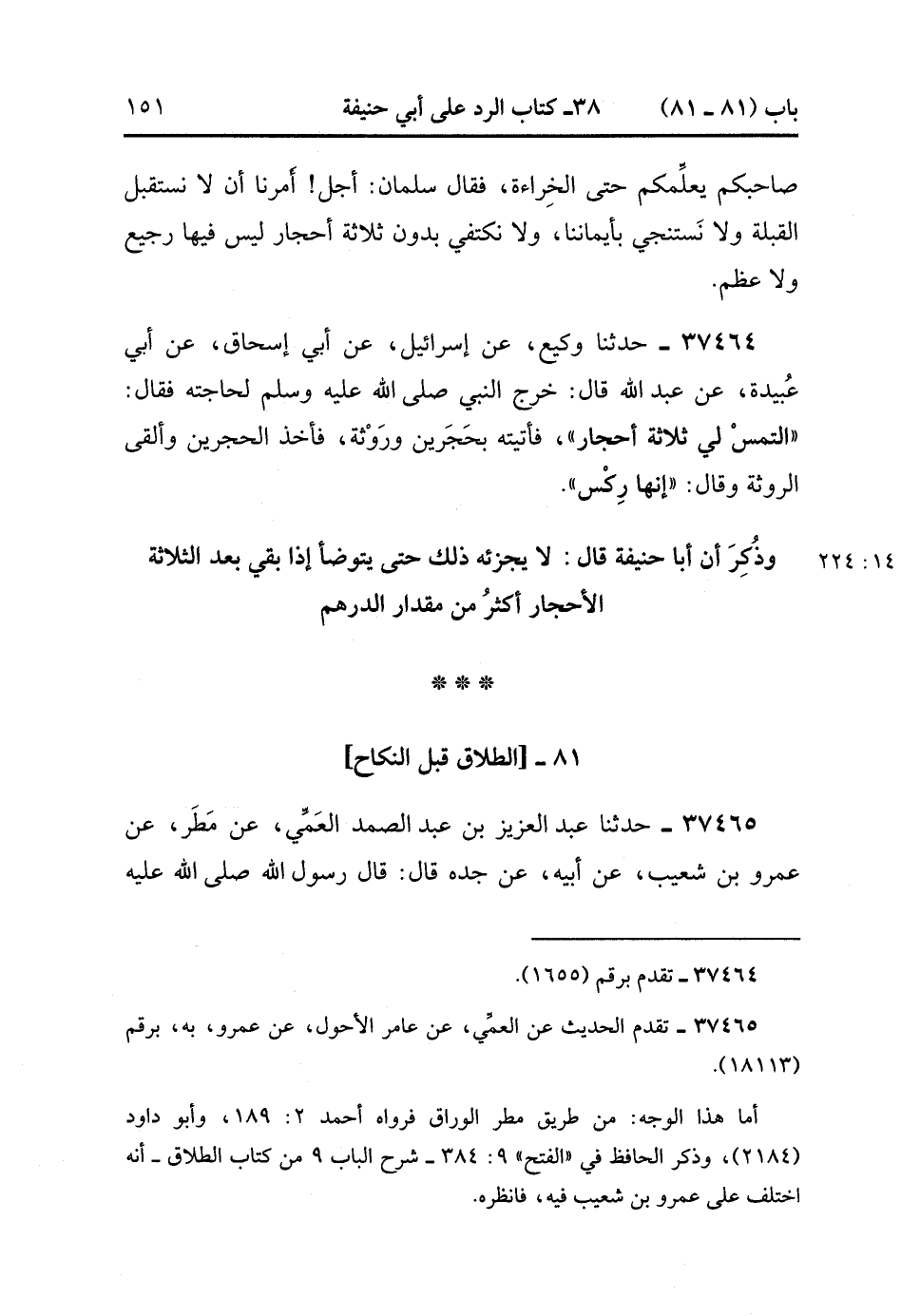 37464- حَدَّثَنَا وَكِيعٌ ، عَنْ إِسْرَائِيلَ ، عَنْ أَبِي إِسْحَاقَ ، عَنْ أَبِي عُبَيْدَةَ ، عَنْ عَبْدِ اللهِ ، قَالَ : خَرَجَ النَّبِيُّ صَلَّى الله عَلَيْهِ وَسَلَّمَ لِحَاجَتِهِ ، فَقَالَ : الْتَمِسْ لِي ثَلاَثَةَ أَحْجَارٍ ، فَأَتَيْتُهُ بِحَجَرَيْنِ وَرَوْثَةٍ ، فَأَخَذَ الْحَجَرَيْنِ وَأَلْقَى الرَّوْثَةَ ، وَقَالَ : إِنَّهَا رِكْسٌ.