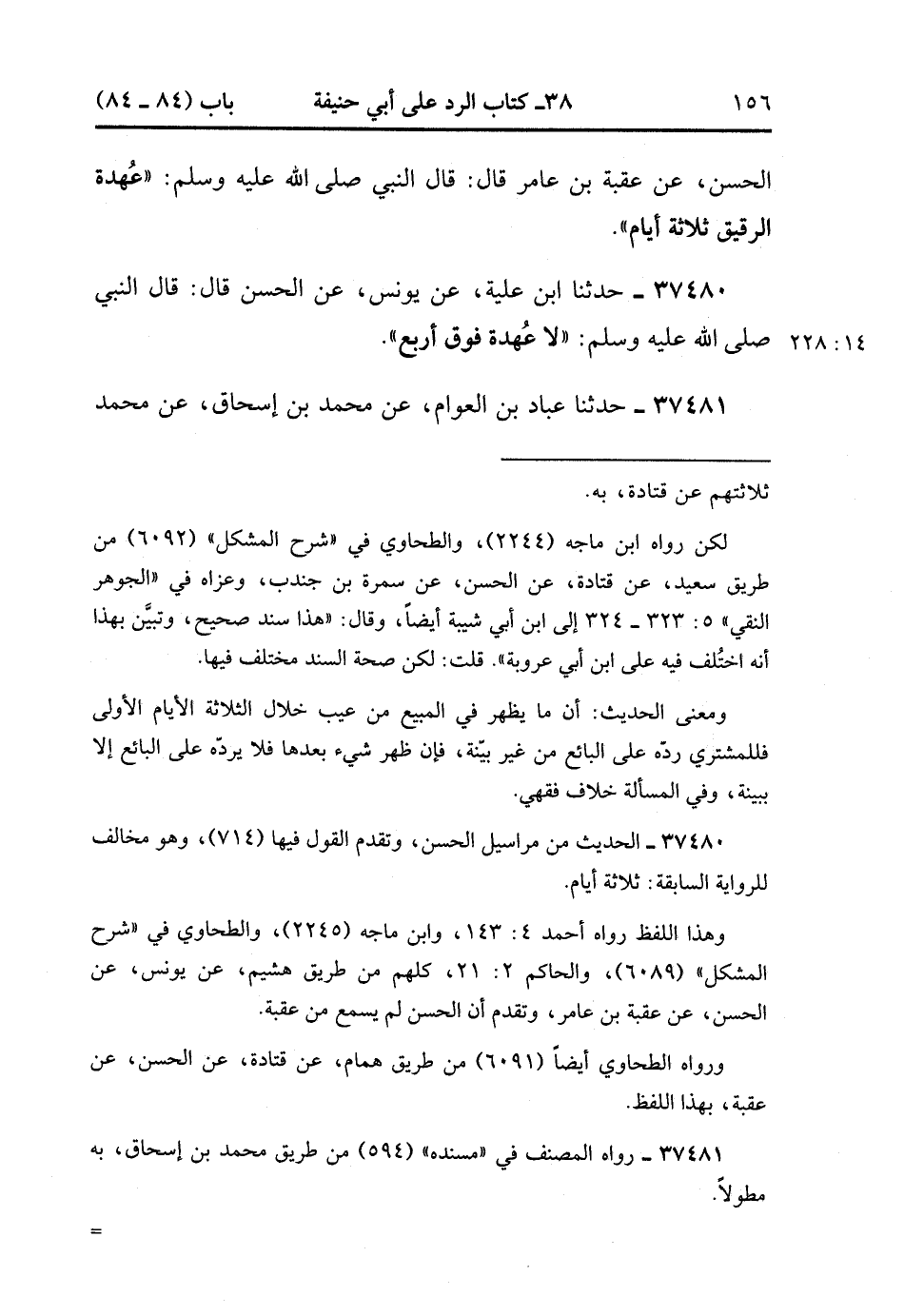 37479- حَدَّثَنَا ابْنُ عُلَيَّةَ ، عَنْ سَعِيدِ بْنِ أَبِي عَرُوبَةَ ، عَنْ قَتَادَةَ ، عَنِ الْحَسَنِ ، عَنْ عُقْبَةَ بْنِ عَامِرٍ ، قَالَ : قَالَ النَّبِيُّ صَلَّى الله عَلَيْهِ وَسَلَّمَ : عُهْدَةُ الرَّقِيقِ ثَلاَثَةُ أَيَّامٍ.