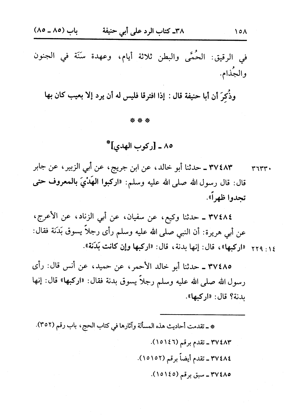 37485- حَدَّثَنَا أَبُو خَالِدٍ الأَحْمَرُ ، عَنْ حُمَيْدٍ ، عَنْ أَنَسٍ ، قَالَ : رَأَى رَسُولُ اللهِ صَلَّى الله عَلَيْهِ وَسَلَّمَ رَجُلاً يَسُوقُ بَدَنَةً ، فَقَالَ : ارْكَبْهَا ، قَالَ : إِنَّهَا بَدَنَةٌ ؟ قَالَ : ارْكَبْهَا. (14/229).