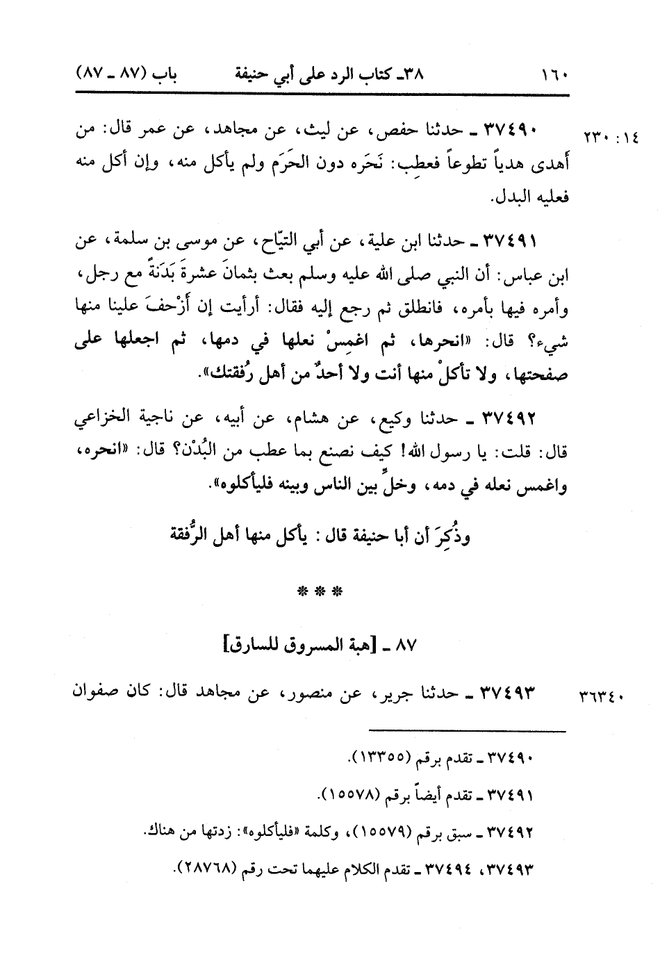 37492- حَدَّثَنَا وَكِيعٌ ، عَنْ هِشَامٍ ، عَنْ أَبِيهِ ، عَنْ نَاجِيَةَ الْخُزَاعِيِّ ، قَالَ : قُلْتُ : يَا رَسُولَ اللهِ ، كَيْفَ نَصْنَعُ بِمَا عَطِبَ مِنَ الْبُدْنِ ؟ قَالَ : انْحَرْهُ ، وَاغْمِسْ نَعْلَهُ فِي دَمِهِ ، وَخَلِّ بَيْنَ النَّاسِ وَبَيْنَهُ فَلْيَأْكُلُوه.