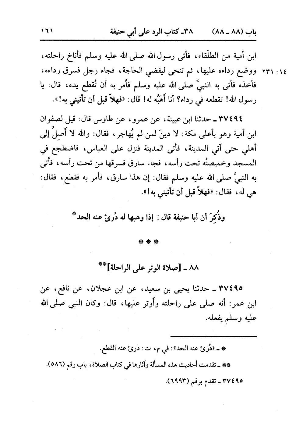 37493- حَدَّثَنَا جَرِيرٌ ، عَنْ مَنْصُورٍ ، عَنْ مُجَاهِدٍ ، قَالَ : كَانَ صَفْوَانُ بْنُ أُمَيَّةَ مِنَ الطُّلَقَاءِ ، فَأَتَى رَسُولَ اللهِ صَلَّى الله عَلَيْهِ وَسَلَّمَ فَأَنَاخَ رَاحِلَتَهُ ، وَوَضَعَ رِدَاءَهُ عَلَيْهَا ، ثُمَّ تَنَحَّى لِيَقْضِيَ الْحَاجَةَ ، فَجَاءَ رَجُلٌ فَسَرَقَ رِدَاءَهُ ، فَأَخَذَهُ فَأَتَى بِهِ النَّبِيَّ صَلَّى الله عَلَيْهِ وَسَلَّمَ ، فَأَمَرَ بِهِ أَنْ تُقْطَعَ يَدُهُ ، قَالَ : يَا رَسُولَ اللهِ ، تَقْطَعُهُ فِي رِدَاءٍ ؟ أَنَا أَهَبُهُ لَهُ ، قَالَ : فَهَلاَّ قَبْلَ أَنْ تَأْتِيَنِي بِهِ. (14/230)