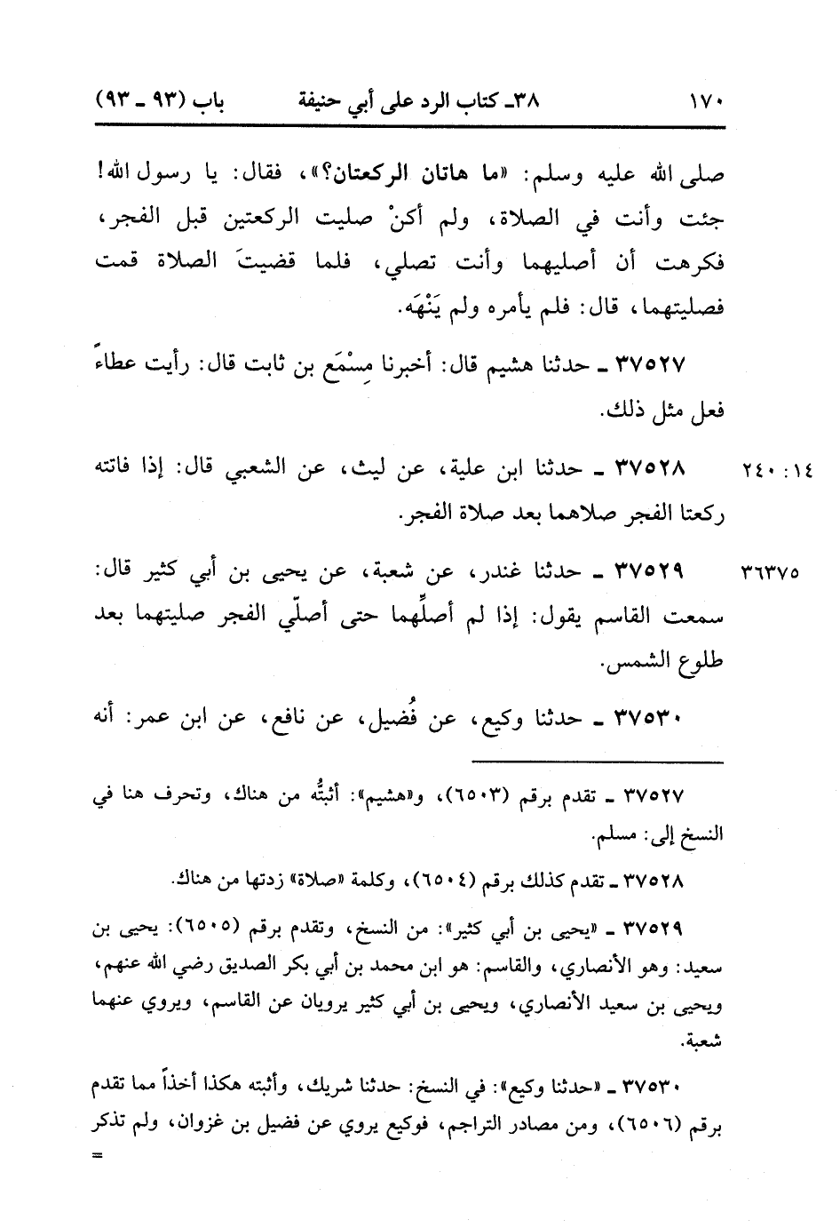37530- حَدَّثَنَا وَكِيعٌ ، عَنْ فُضَيْلٍ ، عَنْ نَافِعٍ ، عَنِ ابْنِ عُمَرَ ؛ أَنَّهُ صَلَّى رَكْعَتَيِ الْفَجْرِ بَعْدَ مَا أَضْحَى.