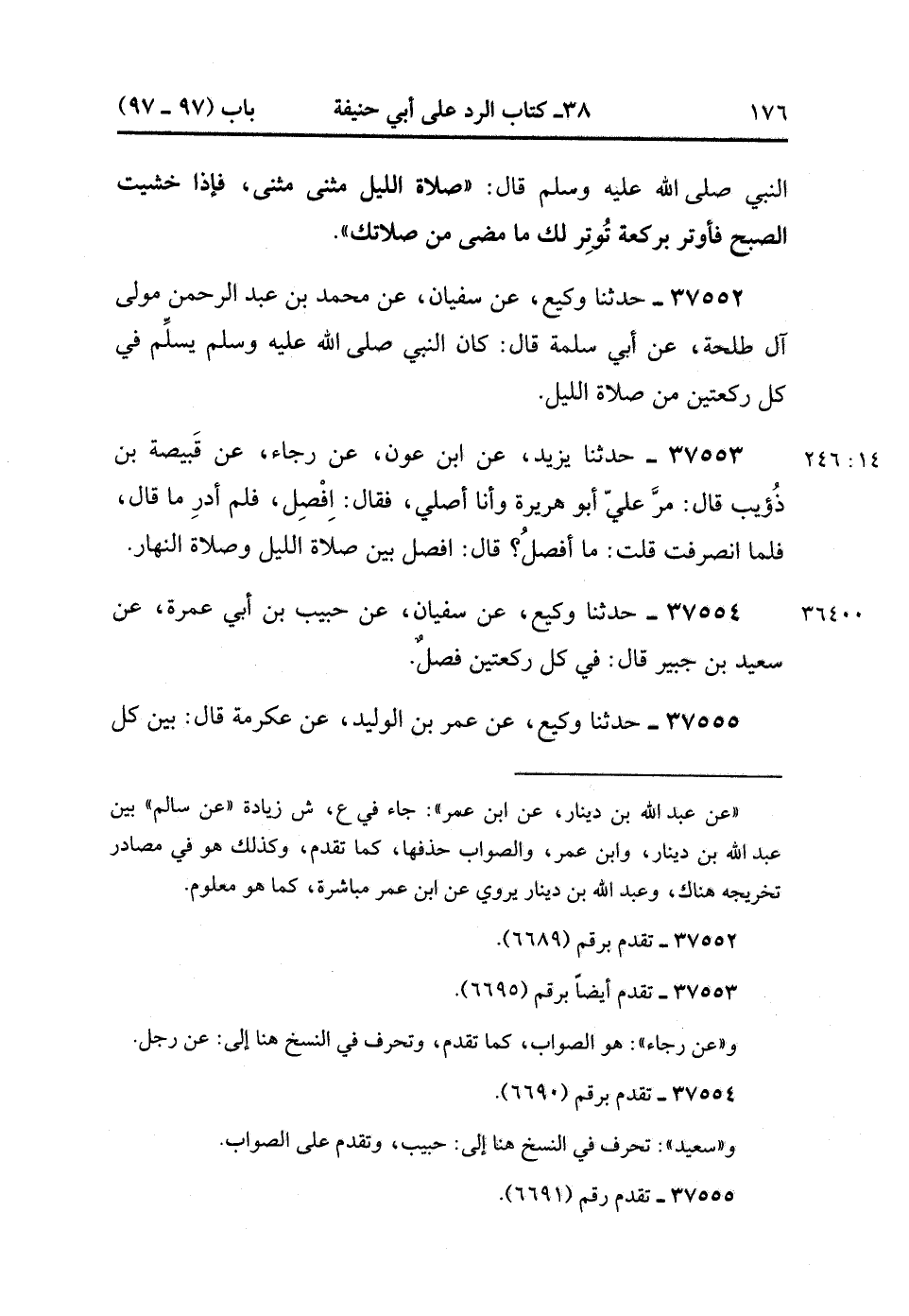 37552- حَدَّثَنَا وَكِيعٌ ، عَنْ سُفْيَانَ ، عَنْ مُحَمَّدِ بْنِ عَبْدِ الرَّحْمَنِ مَوْلَى آلِ طَلْحَةَ ، عَنْ أَبِي سَلَمَةَ ، قَالَ : كَانَ النَّبِيُّ صَلَّى الله عَلَيْهِ وَسَلَّمَ يُسَلِّمُ فِي كُلِّ رَكْعَتَيْنِ مِنْ صَلاَةِ اللَّيْلِ. (14/245)