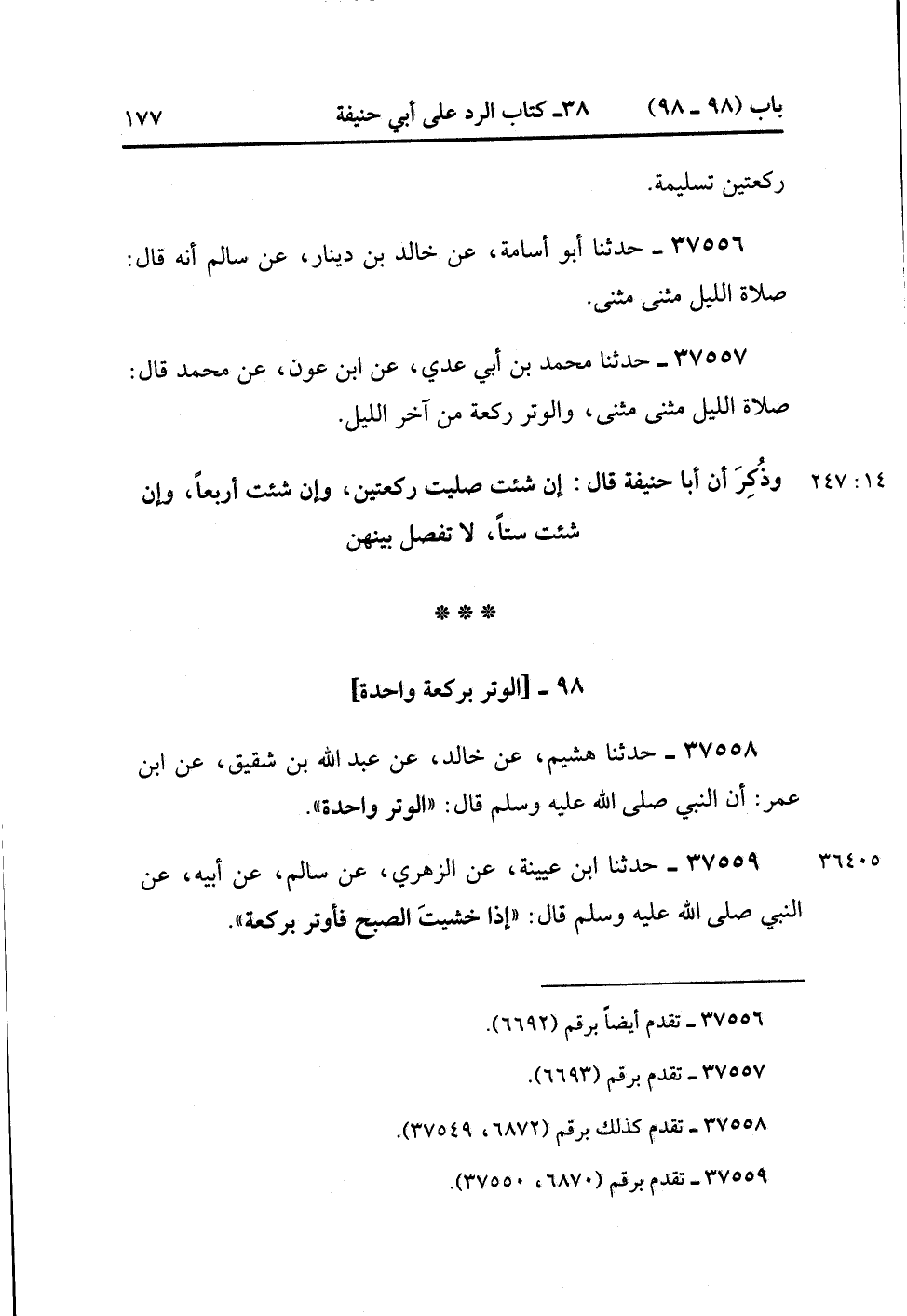 37559- حَدَّثَنَا ابْنُ عُيَيْنَةَ ، عَنِ الزُّهْرِيِّ ، عَنْ سَالِمٍ ، عَنْ أَبِيهِ ، عَنِ النَّبِيِّ صَلَّى الله عَلَيْهِ وَسَلَّمَ ، قَالَ : إِذَا خَشِيتَ الصُّبْحَ فَأَوْتِرْ بِرَكْعَةٍ. (14/247).