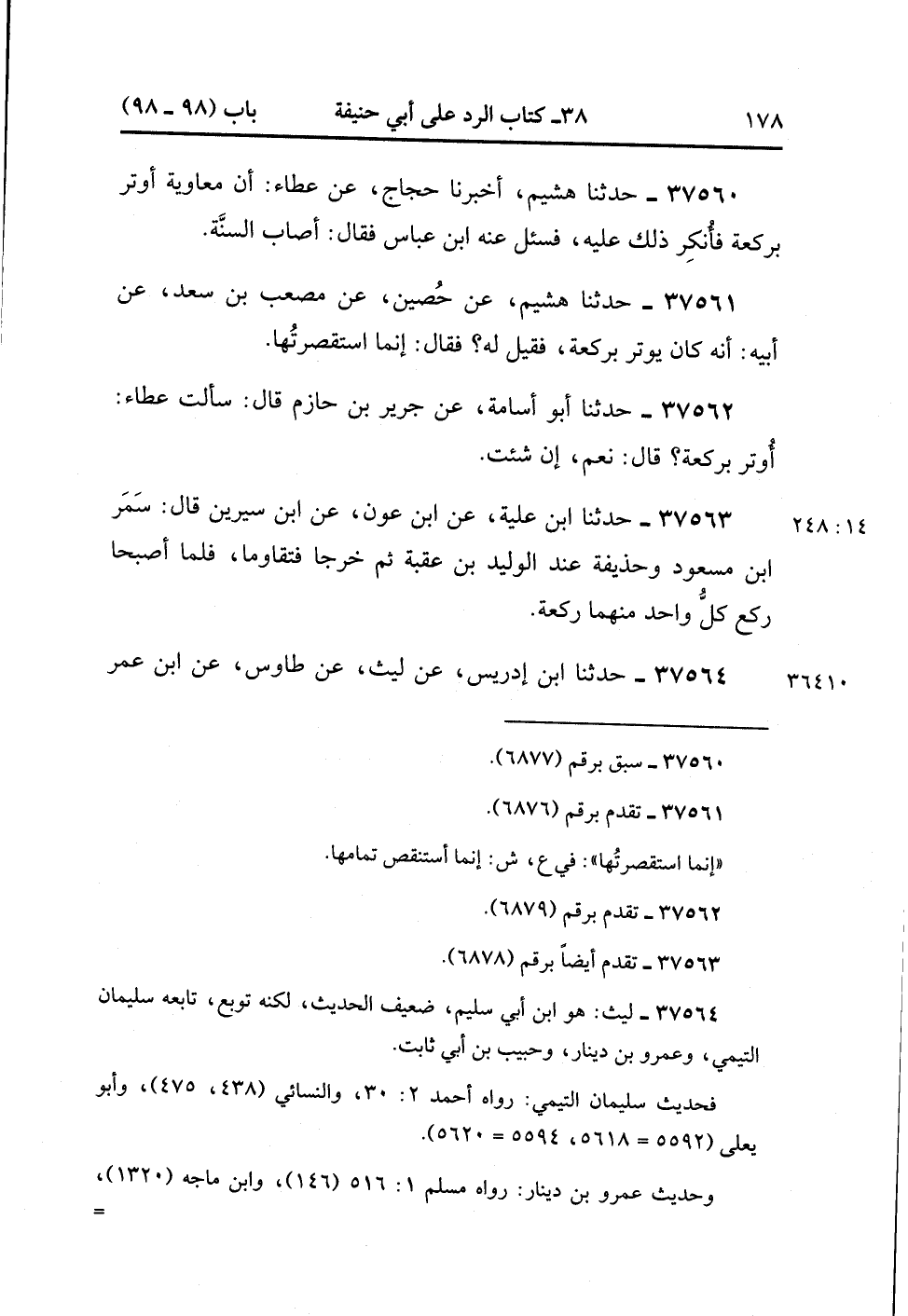 37562- حَدَّثَنَا أَبُو أُسَامَةَ ، عَنْ جَرِيرِ بْنِ حَازِمٍ ، قَالَ : سَأَلْتُ عَطَاءً : أُوتِرُ بِرَكْعَةٍ ؟ قَالَ : نَعَمْ ، إِنْ شِئْتَ. (14/247)