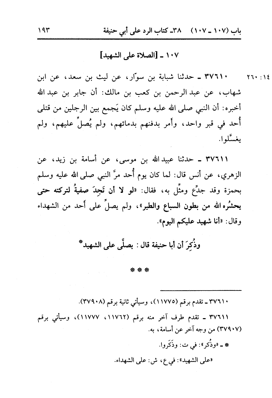 37611- حَدَّثَنَا عُبَيْدُ اللهِ بْنُ مُوسَى ، عَنْ أُسَامَةَ بْنِ زَيْدٍ ، عَنِ الزُّهْرِيِّ ، عَنْ أَنَسٍ ، قَالَ : لَمَّا كَانَ يَوْمُ أُحُدٍ ، مَرَّ النَّبِيُّ صَلَّى الله عَلَيْهِ وَسَلَّمَ بِحَمْزَةَ وَقَدْ جُدِعَ وَمُثِّلَ بِهِ ، فَقَالَ : لَوْلاَ أَنْ تَجِدَ صَفِيَّةُ لَتَرَكْتُهُ حَتَّى يَحْشُرَهُ اللَّهُ مِنْ بُطُونِ السِّبَاعِ وَالطَّيْرِ ، وَلَمْ يُصَلِّ عَلَى أَحَدٍ مِنَ الشُّهَدَاءِ ، وَقَالَ : أَنَا شَهِيدٌ عَلَيْكُمُ الْيَوْمَ.