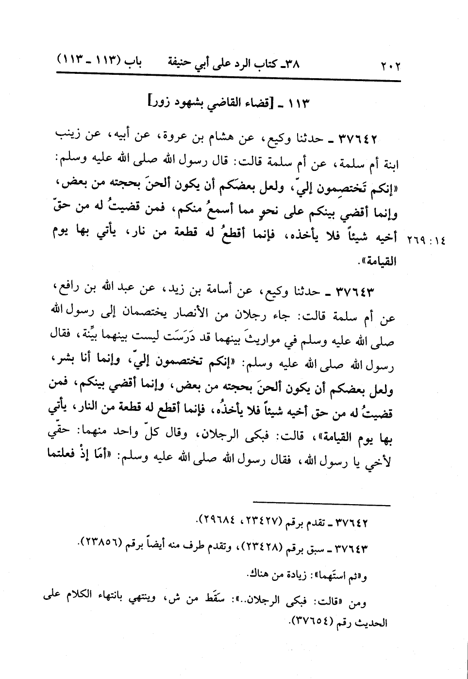 37643- حَدَّثَنَا وَكِيعٌ ، عَنْ أُسَامَةَ بْنِ زَيْدٍ ، عَنْ عَبْدِ اللهِ بْنِ رَافِعٍ ، عَنْ أُمِّ سَلَمَةَ ، قَالَتْ : جَاءَ رَجُلاَنِ مِنَ الأَنْصَارِ يَخْتَصِمَانِ إِلَى رَسُولِ اللهِ صَلَّى الله عَلَيْهِ وَسَلَّمَ فِي مَوَارِيثَ بَيْنَهُمَا قَدْ دَرَسَتْ ، لَيْسَتْ بَيْنَهُمَا بَيِّنَةٌ ، فَقَالَ رَسُولُ اللهِ صَلَّى الله عَلَيْهِ وَسَلَّمَ : إِنَّكُمْ تَخْتَصِمُونَ إِلَيَّ ، وَإِنَّمَا أَنَا بَشَرٌ ، وَلَعَلَّ بَعْضَكُمْ أَنْ يَكُونَ أَلْحَنَ بِحُجَّتِهِ مِنْ بَعْضٍ ، وَإِنَّمَا أَقْضِي بَيْنَكُمْ ، فَمَنْ قَضَيْتُ لَهُ مِنْ حَقِّ أَخِيهِ شَيْئًا فَلاَ يَأْخُذْهُ ، فَإِنَّمَا أَقْطَعُ لَهُ قِطْعَةً مِنَ النَّارِ ، يَأْتِي بِهِا يَوْمِ الْقِيَامَةِ ، قَالَتْ : فَبَكَى الرَّجُلاَنِ ، وَقَالَ كُلُّ وَاحِدٍ مِنْهُمَا : حَقِّي لأَخِي يَا رَسُولَ اللهِ ، فَقَالَ رَسُولُ اللهِ صَلَّى الله عَلَيْهِ وَسَلَّمَ : أَمَا إِذْ فَعَلْتُمَا ، فَاذْهَبَا فَاقْتَسِمَا ، وَتَوَخَّيَا الْحَقَّ ، ثُمَّ اسْتَهمَا ، ثُمَّ لِيُحَلِّلْ كُلّ وَاحِدٍ مِنْكُمَا صَاحِبَهُ. (14/269).