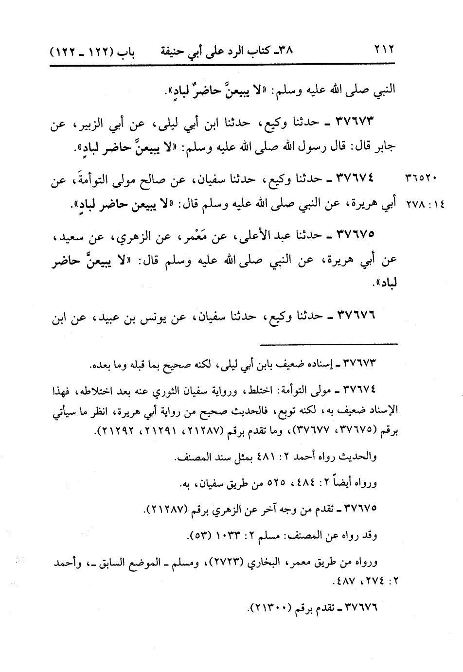 37674- حَدَّثَنَا وَكِيعٌ ، حَدَّثَنَا سُفْيَانُ ، عَنْ صَالِحٍ مَوْلَى التَّوْأَمَةِ ، عَنْ أَبِي هُرَيْرَةَ ، عَنِ النَّبِيِّ صَلَّى الله عَلَيْهِ وَسَلَّمَ ، قَالَ : لاَ يَبِيعَنَّ حَاضِرٌ لِبَادٍ. (14/277)