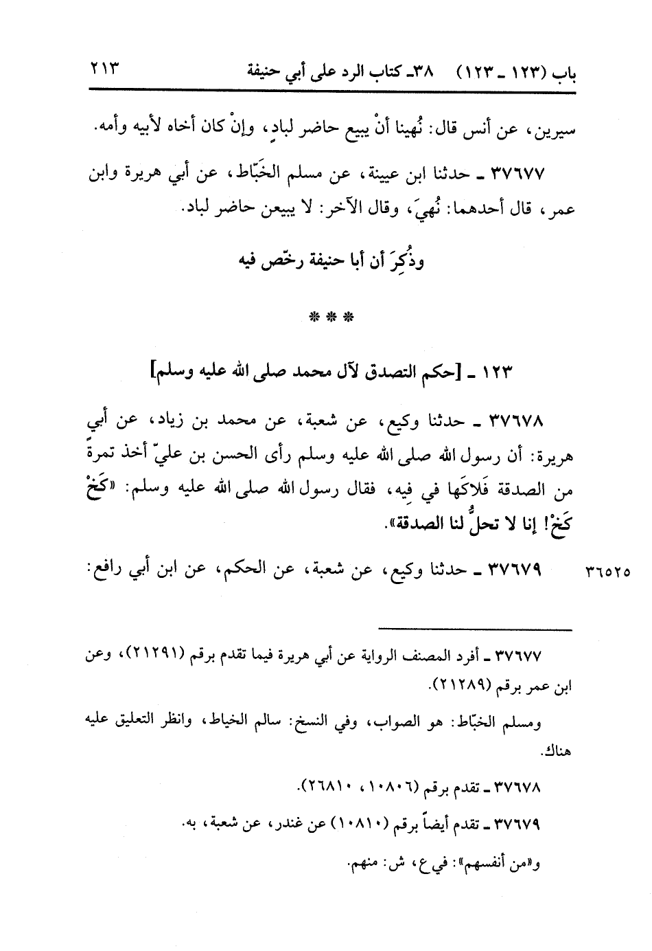 37678- حَدَّثَنَا وَكِيعٌ ، عَنْ شُعْبَةَ ، عَنْ مُحَمَّدِ بْنِ زِيَادٍ ، عَنْ أَبِي هُرَيْرَةَ ؛ أَنَّ رَسُولَ اللهِ صَلَّى الله عَلَيْهِ وَسَلَّمَ رَأَى الْحَسَنَ بْنَ عَلِيٍّ أَخَذَ تَمْرَةً مِنَ الصَّدَقَةِ ، فَلاَكَهَا فِي فِيهِ ، فَقَالَ رَسُولُ اللهِ صَلَّى الله عَلَيْهِ وَسَلَّمَ : كَخْ كَخْ ، إِنَّا لاَ تَحِلُّ لَنَا الصَّدَقَةُ. (14/278)