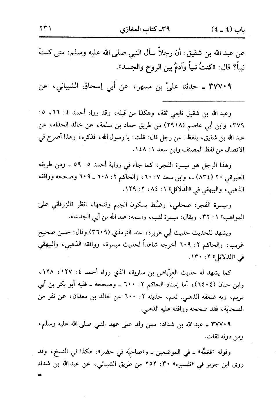 37708- حدَّثَنَا عَفَّانَ ، قَالَ : حَدَّثَنَا وُهَيْبٌ ، قَالَ : حَدَّثَنَا خَالِدٌ الْحَذَّاءُ ، عَنْ عَبْدِ اللهِ بْنِ شَقِيقٍ ؛ أَنَّ رَجُلاً سَأَلَ النَّبِيَّ صَلَّى الله عَلَيْهِ وَسَلَّمَ : مَتَى كُنْتَ نَبِيًّا ؟ قَالَ : كُنْتُ نَبِيًّا وَآدَمُ بَيْنَ الرُّوحِ وَالْجَسَدِ.