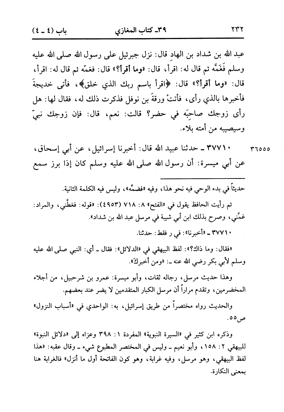 37710- حَدَّثَنَا عُبَيْدُ اللهِ , قَالَ : أَخْبَرَنَا إسْرَائِيلُ ، عَنْ أَبِي إِسْحَاقَ ، عَنْ أَبِي مَيْسَرَةَ ؛ أَنَّ رَسُولَ اللهِ صَلَّى الله عَلَيْهِ وَسَلَّمَ كَانَ إِذَا بَرَزَ سَمِعَ مَنْ يُنَادِيهِ : يَا مُحَمَّدُ ، فَإِذَا سَمِعَ الصَّوْتَ انْطَلَقَ هَارِبًا ، فَأَتَى خَدِيجَةَ فَذَكَرَ ذَلِكَ لَهَا ، فَقَالَ : يَا خَدِيجَةُ ، قَدْ خَشِيتُ أَنْ يَكُونَ قَدْ خَالَطَ عَقْلِي شَيْءٌ ، إِنِّي إِذَا بَرَزْتُ أَسْمَعُ مَنْ يُنَادِي ، فَلاَ أَرَى شَيْئًا ، فَأَنْطَلِقُ هَارِبًا ، فَإِذَا هُوَ عِنْدِي يُنَادِينِي ، فَقَالَتْ : مَا كَانَ اللَّهُ لِيَفْعَلَ بِكَ ذَلِكَ ، إِنَّك مَا عَلِمْتُ تَصْدُقُ الْحَدِيثَ ، وَتُؤَدِّي الأَمَانَةَ ، وَتَصِلُ الرَّحِمَ ، فَمَا كَانَ اللَّهُ لِيَفْعَلَ بِكَ ذَلِكَ ، فَأَسَرَّتْ ذَلِكَ إِلَى أَبِي بَكْرٍ ، وَكَانَ نَدِيمًا لَهُ فِي الْجَاهِلِيَّةِ ، فَأَخَذَ أَبُو بَكْرٍ بِيَدِهِ ، فَانْطَلَقَ بِهِ إِلَى وَرَقَةَ ، فَقَالَ : وَمَا ذَاكَ ؟ فَحَدَّثَهُ بِمَا حَدَّثَتْهُ خَدِيجَةُ ، فَأَتَى وَرَقَةَ فَذَكَرَ ذَلِكَ لَهُ ، فَقَالَ وَرَقَةُ : (14/293).