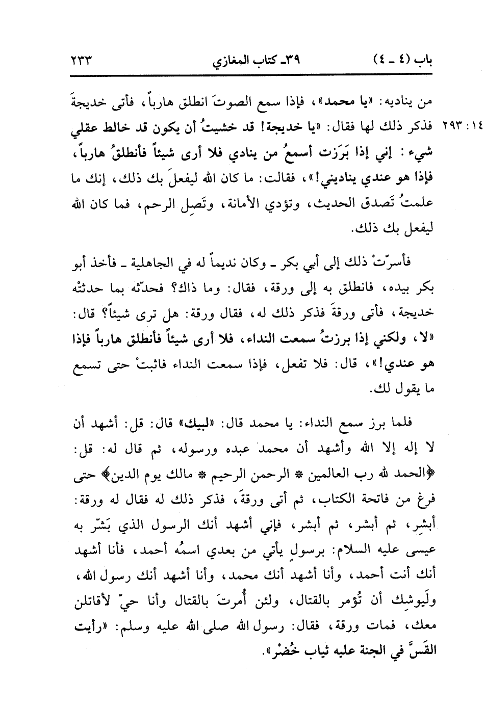هَلْ تَرَى شَيْئًا ؟ قَالَ : لاَ ، وَلَكِنِّي إِذَا بَرَزْتُ سَمِعْتُ النِّدَاءَ ، فَلاَ أَرَى شَيْئًا ، فَأَنْطَلِقُ هَارِبًا ، فَإِذَا هُوَ عِنْدِي ، قَالَ : فَلاَ تَفْعَلْ ، فَإِذَا سَمِعْتَ النِّدَاءَ فَاثْبُتْ حَتَّى تَسْمَعَ مَا يَقُولُ لَكَ ، فَلَمَّا بَرَزَ سَمِعَ النِّدَاءَ : يَا مُحَمَّدُ ، قَالَ : لَبَّيْكَ ، قَالَ : قُلْ : أَشْهَدُ أَنْ لاَ إِلَهَ إِلاَّ اللَّهُ ، وَأَشْهَدُ أَنَّ مُحَمَّدًا عَبْدُهُ وَرَسُولُهُ ، ثُمَّ قَالَ لَهُ : قُلَ : {الْحَمْدُ لِلَّهِ رَبِّ الْعَالَمِينَ ، الرَّحْمَن الرَّحِيمِ ، مَالِكِ يَوْمِ الدِّينِ} حَتَّى فَرَغَ مِنْ فَاتِحَةِ الْكِتَابِ ، ثُمَّ أَتَى وَرَقَةَ فَذَكَرَ ذَلِكَ لَهُ ، فَقَالَ لَهُ وَرَقَةُ : أَبْشِرْ ، ثُمَّ أَبْشِرْ ، ثُمَّ أَبْشِرْ ، فَإِنِّي أَشْهَدُ أَنَّك الرَّسُولُ الَّذِي بَشَّرَ بِهِ عِيسَى عَلَيْهِ السَّلاَمُ : {بِرَسُولٍ يَأْتِي مِنْ بَعْدِي اسْمُهُ أَحْمَدُ} ، فَأَنَا أَشْهَدُ أَنَّك أَنْتَ أَحْمَدُ ، وَأَنَا أَشْهَدُ أَنَّك مُحَمَّد ، وَأَنَا أَشْهَدُ أَنَّك رَسُولُ اللهِ ، وَلَيُوشِكُ أَنْ تُؤْمَرَ بِالْقِتَالِ ، وَلَئِنْ أُمِرْتَ بِالْقِتَالِ وَأَنَا حَيٌّ لأُقَاتِلَنَّ مَعَكَ ، فَمَاتَ وَرَقَةُ ، فَقَالَ رَسُولُ اللهِ صَلَّى الله عَلَيْهِ وَسَلَّمَ : رَأَيْتُ الْقَسَّ فِي الْجَنَّةِ ، عَلَيْهِ ثِيَابٌ خُضْرٌ. (14/293).