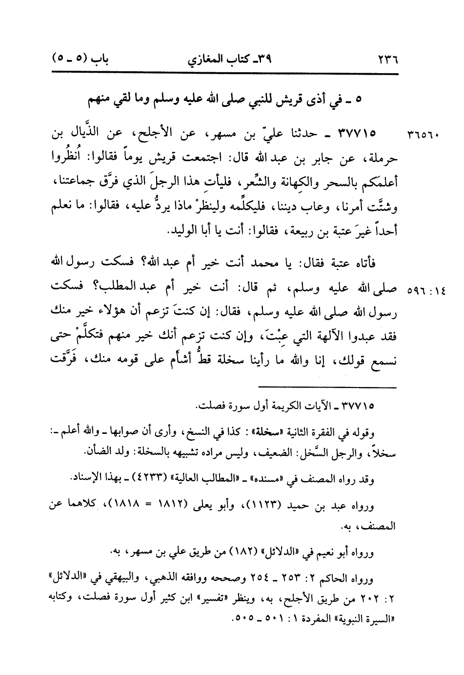 37715- حدَّثَنَا عَلِيُّ بْنُ مُسْهِرٍ ، عَنِ الأَجْلَحِ ، عَنِ الذَّيَّالِ بْنِ حَرْمَلَةَ ، عَنْ جَابِرِ بْنِ عَبْدِ اللهِ ، قَالَ : اجْتَمَعَتْ قُرَيْشٌ يَوْمًا ، فَقَالُوا : انْظُرُوا أَعْلَمَكُمْ بِالسِّحْرِ وَالْكِهَانَةِ وَالشِّعْرِ ، فَلْيَأْتِ هَذَا الرَّجُلَ الَّذِي فَرَّقَ جَمَاعَتَنَا ، وَشَتَّتْ أَمْرَنَا ، وَعَابَ دِينَنَا ، فَلْيُكَلِّمْهُ ، وَلْيَنْظُرْ مَاذَا يَرُدُّ عَلَيْهِ ، فَقَالُوا : مَا نَعْلَمُ أَحَدًا غَيْرَ عُتْبَةَ بْنَ رَبِيعَةَ ، فَقَالُوا : أَنْتَ يَا أَبَا الْوَلِيد ، فَأَتَاهُ عُتْبَةُ ، فَقَالَ : يَا مُحَمَّدُ ، أَنْتَ خَيْرٌ ، أَمْ عَبْدُ اللهِ ؟ فَسَكَتَ رَسُولُ اللهِ صَلَّى الله عَلَيْهِ وَسَلَّمَ ، ثُمَّ قَالَ : أَنْتَ خَيْرٌ ، أَمْ عَبْدُ الْمُطَّلِبِ ؟ فَسَكَتَ رَسُولُ اللهِ صَلَّى الله عَلَيْهِ وَسَلَّمَ ، فَقَالَ : إِنْ كُنْتَ تَزْعُمُ أَنَّ هَؤُلاَءِ خَيْرٌ مِنْك ، فَقَدْ عَبَدُوا الآلِهَةَ الَّتِي عِبْتَ ، وَإِنْ كُنْتَ تَزْعُمُ أَنَّك خَيْرٌ مِنْهُمْ فَتَكَلَّمْ حَتَّى نَسْمَعَ قَوْلَك ، إِنَّا وَاللهِ مَا رَأَيْنَا سَخْلَةً قَطُّ أَشْأَمَ عَلَى قَوْمِهِ مِنْك ، فَرَّقْتَ جَمَاعَتَنَا ، وَشَتَّتَ أَمْرَنَا ، وَعِبْتَ دِينَنَا ، وَفَضَحْتَنَا فِي الْعَرَبِ ، حَتَّى لَقَدْ طَارَ فِيهِمْ أَنَّ فِي قُرَيْشٍ سَاحِرًا ، وَأَنَّ فِي قُرَيْشٍ كَاهِنًا ، وَاللهِ مَا نَنْتَظِرُ إِلاَّ مِثْلَ صَيْحَةِ الْحُبْلَى ، أَنْ يَقُومَ بَعْضُنَا لِبَعْضٍ بِالسُّيُوفِ حَتَّى نَتَفَانَى. (14/296).
