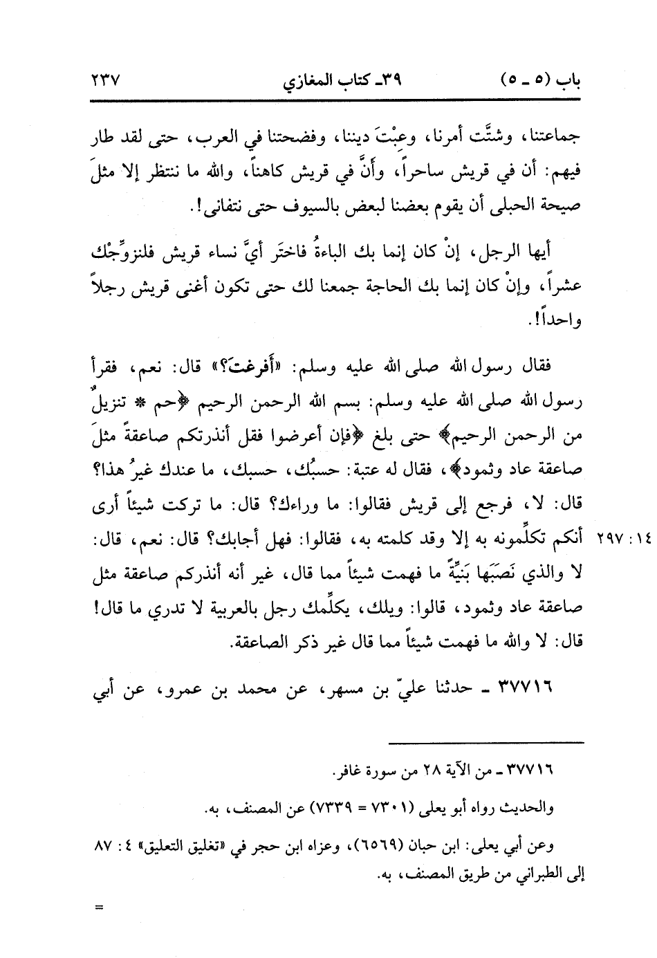 أَيُّهَا الرَّجُلُ ، إِنْ كَانَ إِنَّمَا بِكَ الْبَاءَةُ ، فَاخْتَرْ أَيَّ نِسَاءِ قُرَيْشٍ فَلْنُزَوِّجُك عَشْرًا ، وَإِنْ كَانَ إِنَّمَا بِكَ الْحَاجَةُ ، جَمَعْنَا لَك حَتَّى تَكُونَ أَغْنَى قُرَيْشٍ رَجُلاً وَاحِدًا ، فَقَالَ رَسُولُ اللهِ صَلَّى الله عَلَيْهِ وَسَلَّمَ : أَفَرَغْتَ ؟ قَالَ : نَعَمْ ، فَقَرَأَ رَسُولُ اللهِ صَلَّى الله عَلَيْهِ وَسَلَّمَ : بسم الله الرَّحْمَن الرحيم{حم تَنْزِيلٌ مِنَ الرَّحْمَن الرَّحِيمِ} حَتَّى بَلَغَ : {فَإِنْ أَعْرَضُوا فَقُلْ أَنْذَرْتُكُمْ صَاعِقَةً مِثْلَ صَاعِقَةِ عَادٍ وَثُمَّودَ ْ} ، فَقَالَ لَهُ عُتْبَةُ : حَسْبُك حَسْبُك ، مَا عِنْدَكَ غَيْرُ هَذَا ؟ قَالَ : لاَ ، فَرَجَعَ إِلَى قُرَيْشٍ ، فَقَالُوا : مَا وَرَاءَك ؟ قَالَ : مَا تَرَكْتُ شَيْئًا أَرَى أَنَّكُمْ تُكَلِّمُونَهُ بِهِ إِلاَّ وَقَدْ كَلَّمْتُهُ بِهِ ، فَقَالُوا : فَهَلْ أَجَابَك ؟ قَالَ : نَعَمْ ؛ قَالَ : لاَ ، وَالَّذِي نَصَبَهَا بَيِّنَةً مَا فَهِمْتُ شَيْئًا مِمَا قَالَ : غَيْرَ أَنَّهُ أَنْذَرَكُمْ صَاعِقَةً مِثْلَ صَاعِقَةِ عَادٍ وَثُمَّودَ ، قَالُوا : وَيْلَك ، يُكَلِّمُك رَجُلٌ بِالْعَرَبِيَّةِ لاَ تَدْرِي مَا قَالَ : قَالَ : لاَ وَاللهِ ، مَا فَهِمْتُ شَيْئًا مِمَا قَالَ غَيْرَ ذِكْرِ الصَّاعِقَةِ. (14/297).