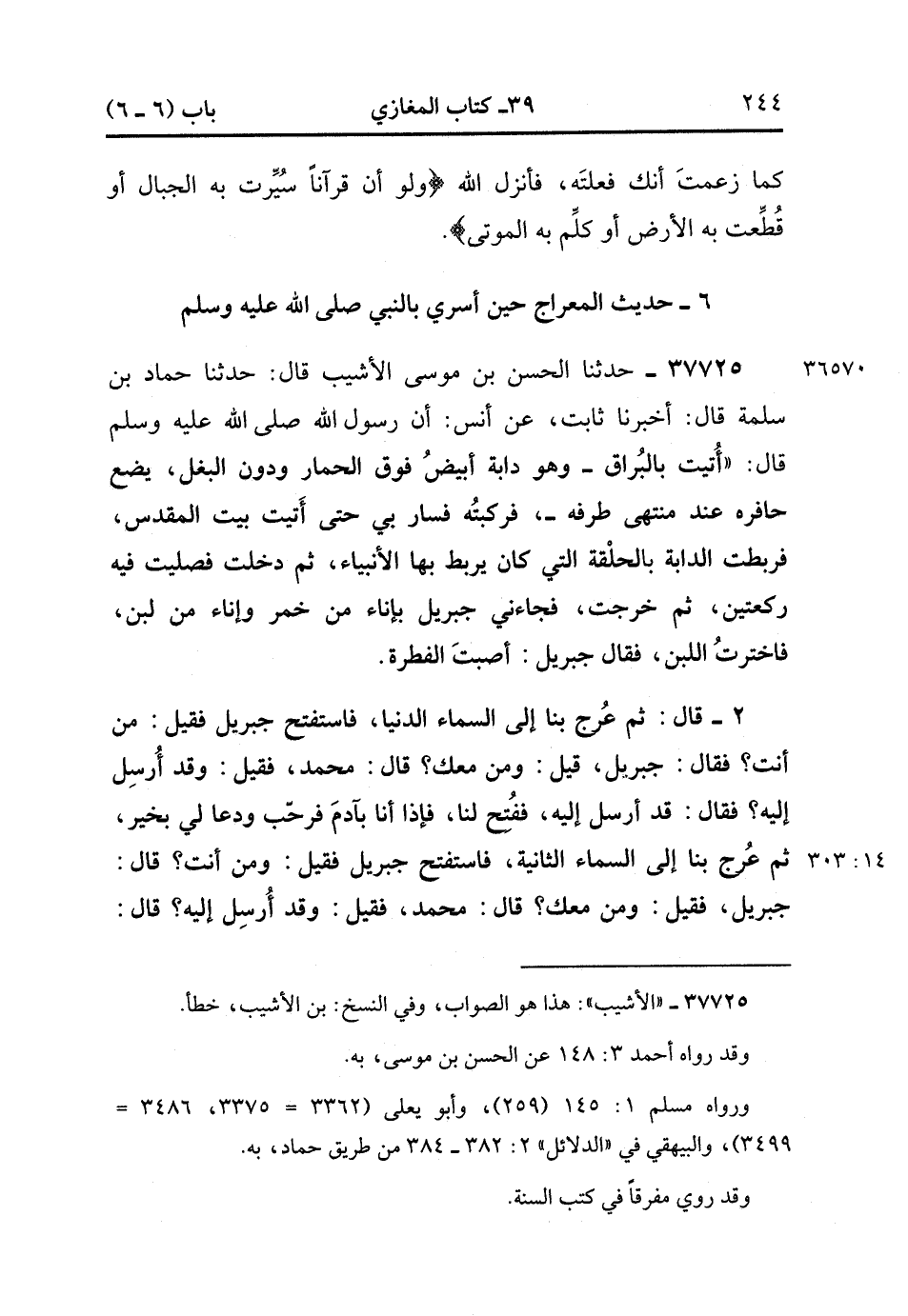 37725- حدَّثَنَا الْحَسَنُ بْنُ مُوسَى الأَشْيَبِ ، قَالَ : حَدَّثَنَا حَمَّادُ بْنُ سَلَمَةَ , قَالَ : أَخْبَرَنَا ثَابِتٌ ، عَنْ أَنَسٍ ؛ أَنَّ رَسُولَ اللهِ صَلَّى الله عَلَيْهِ وَسَلَّمَ ، قَالَ : أُتِيتُ بِالْبُرَاقِ ، وَهُوَ دَابَّةٌ أَبْيَضُ فَوْقَ الْحِمَارِ وَدُونَ الْبَغْلِ ، يَضَعُ حَافِرَهُ عِنْدَ مُنْتَهَى طَرَفِهِ ، فَرَكِبْتُهُ ، فَسَارَ بِي حَتَّى أَتَيْتُ بَيْتَ الْمَقْدِسِ ، فَرَبَطْتُ الدَّابَّةَ بِالْحَلَقَةِ الَّتِي كَانَ يَرْبِطُ بِهَا الأَنْبِيَاءُ ، ثُمَّ دَخَلْتُ فَصَلَّيْتُ فِيهِ رَكْعَتَيْنِ ، ثُمَّ خَرَجْتُ فَجَاءَنِي جِبْرِيلُ بِإِنَاءٍ مِنْ خَمْرٍ وَإِنَاءٍ مِنْ لَبَنٍ ، فَاخْتَرْتُ اللَّبَنَ ، فَقَالَ جِبْرِيلُ : أَصَبْتَ الْفِطْرَةَ ، قَالَ : ثُمَّ عُرِجَ بِنَا إِلَى السَّمَاءِ الدُّنْيَا ، فَاسْتَفْتَحَ جِبْرِيلُ ، فَقِيلَ : مَنْ أَنْتَ ؟ فَقَالَ : جِبْرِيلُ ، قِيلَ : وَمَنْ مَعَكَ ؟ قَالَ : مُحَمَّد ، فَقِيلَ : وَقَدْ أُرْسِلَ إِلَيْهِ ؟ فَقَالَ : قَدْ أُرْسِلَ إِلَيْهِ ، فَفُتِحَ لَنَا ، فَإِذَا أَنَا بِآدَمَ ، فَرَحَّبَ وَدَعَا لِي بِخَيْرٍ ، ثُمَّ عُرِجَ بِنَا إِلَى السَّمَاءِ الثَّانِيَةِ ، فَاسْتَفْتَحَ جِبْرِيلُ ، فَقِيلَ : وَمَنْ أَنْتَ ؟ قَالَ : جِبْرِيلُ ، فَقِيلَ : وَمَنْ مَعَكَ ؟ قَالَ : مُحَمَّد ، فَقِيلَ : وَقَدْ أُرْسِلَ إِلَيْهِ ؟ قَالَ : قَدْ أُرْسِلَ إِلَيْهِ ، فَفُتِحَ لَنَا ، فَإِذَا أَنَا بِابْنَيَ الْخَالَةِ يَحْيَى وَعِيسَى ، فَرَحَّبَا وَدَعَوا لِي بِخَيْرٍ ، ثُمَّ عُرِجَ بِنَا إِلَى السَّمَاءِ الثَّالِثَةِ ، فَاسْتَفْتَحَ جِبْرِيلُ ، (14/302).
