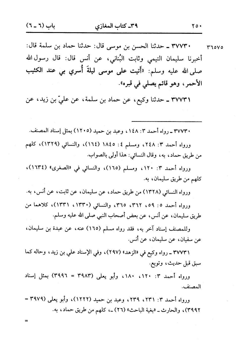 37730- حَدَّثَنَا الْحَسَنُ بْنُ مُوسَى , قَالَ : حدَّثَنَا حَمَّادُ بْنُ سَلَمَةَ , قَالَ : أَخْبَرَنَا سُلَيْمَانُ التَّيْمِيُّ ، وَثَابِتٌ الْبُنَانِيُّ ، عَنْ أَنَسٍ ، قَالَ : قَالَ رَسُولُ اللهِ صَلَّى الله عَلَيْهِ وَسَلَّمَ : أَتَيْتُ عَلَى مُوسَى لَيْلَةَ أُسْرِيَ بِي عِنْدَ الْكَثِيبِ الأَحْمَرِ ، وَهُوَ قَائِمٌ يُصَلِّي فِي قَبْرِهِ. (14/307)