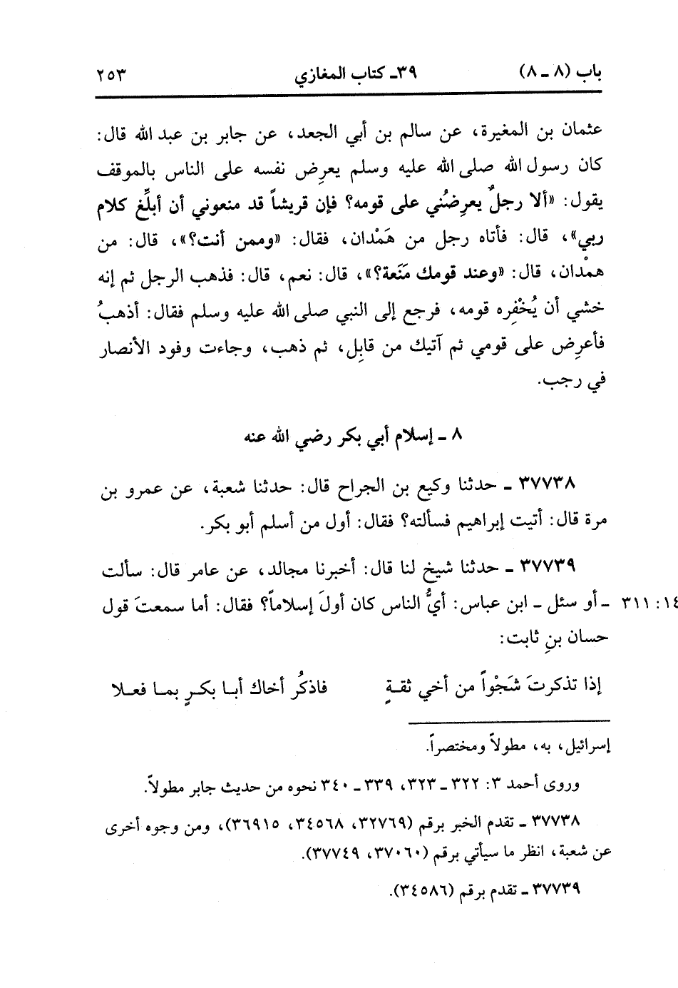 37737- حدَّثَنَا مُحَمَّدُ بْنُ عَبْدِ اللهِ الأَسَدِيُّ ، عَنْ إِسْرَائِيلَ ، عَنْ عُثْمَانَ بْنِ الْمُغِيرَةِ ، عَنْ سَالِمِ بْنِ أَبِي الْجَعْدِ ، عَنْ جَابِرِ بْنِ عَبْدِ اللهِ ، قَالَ : كَانَ رَسُولُ اللهِ صَلَّى الله عَلَيْهِ وَسَلَّمَ يَعْرِضُ نَفْسَهُ عَلَى النَّاسِ بِالْمَوْقِفِ ، يَقُولُ : أَلاَ رَجُلٌ يَعْرِضُنِي عَلَى قَوْمِهِ ؟ فَإِنَّ قُرَيْشًا قَدْ مَنَعُونِي أَنْ أُبَلِّغَ كَلاَمَ رَبِّي ، قَالَ : فَأَتَاهُ رَجُلٌ مِنْ هَمْدَانَ ، فَقَالَ : وَمِمَّنْ أَنْتَ ؟ قَالَ : مِنْ هَمْدَانَ ، قَالَ : وَعِنْدَ قَوْمِكَ مَنَعَةٌ ؟ قَالَ : نَعَمْ ، قَالَ : فَذَهَبَ الرَّجُلُ ، ثُمَّ إِنَّهُ خَشِيَ أَنْ يَخْفِرَهُ قَوْمُهُ ، فَرَجَعَ إِلَى النَّبِيِّ صَلَّى الله عَلَيْهِ وَسَلَّمَ ، فَقَالَ : أَذْهَبُ فَأَعْرِضُ عَلَى قَوْمِي ، ثُمَّ آتِيكَ مِنْ قَابِلٍ ، ثُمَّ ذَهَبَ وَجَاءَتْ وُفُودُ الأَنْصَارِ فِي رَجَبٍ.