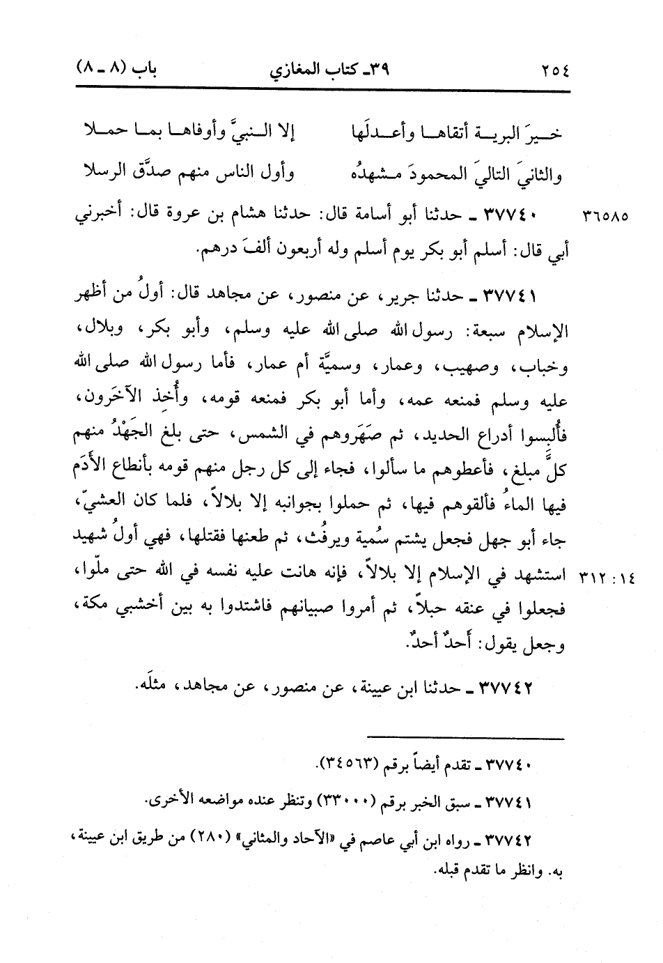 37741- حَدَّثَنَا جَرِيرٌ ، عَنْ مَنْصُورٍ ، عَنْ مُجَاهِدٍ ، قَالَ : أَوَّلُ مَنْ أَظْهَرَ الإِسْلاَمَ سَبْعَةٌ : رَسُولُ اللهِ صَلَّى الله عَلَيْهِ وَسَلَّمَ ، وَأَبُو بَكْرٍ ، وَبِلاَلٌ ، وَخَبَّابٌ ، وَصُهَيْبٌ ، وَعَمَّارٌ ، وَسُمَيَّةُ أُمُّ عَمَّارٍ ، فَأَمَّا رَسُولُ اللهِ صَلَّى الله عَلَيْهِ وَسَلَّمَ فَمَنَعَهُ عَمُّهُ ، وَأَمَّا أَبُو بَكْرٍ فَمَنَعَهُ قَوْمُهُ ، وَأُخِذَ الآخَرُونَ فَأُلْبِسُوا أَدْرَاعَ الْحَدِيدِ ، ثُمَّ صَهَرُوهُمْ فِي الشَّمْسِ ، حَتَّى بَلَغَ الْجَهْدُ مِنْهُمْ كُلَّ مَبْلَغٍ ، فَأَعْطَوْهُمْ مَا سَأَلُوا ، فَجَاءَ إِلَى كُلِّ رَجُلٍ مِنْهُمْ قَوْمُهُ بِأَنْطَاعِ الأُدْمِ فِيهَا الْمَاءُ ، فَأَلْقُوهُمْ فِيهَا ، ثُمَّ حُمِلُوا بِجَوَانِبِهِ إِلاَّ بِلاَلاً ، فَلَمَّا كَانَ الْعَشِيُّ ، جَاءَ أَبُو جَهْلٍ فَجَعَلَ يَشْتُمُ سُمَيَّةَ وَيَرْفُثُ ، ثُمَّ طَعنها فَقَتَلَهَا ، فَهِيَ أَوَّلُ شَهِيدٍ اسْتُشْهِدَ فِي الإِسْلاَمِ ، إِلاَّ بِلاَلاً ، فَإِنَّهُ هَانَتْ عَلَيْهِ نَفْسُهُ فِي اللهِ حَتَّى مَلُّوا ، فَجَعَلُوا فِي عُنُقِهِ حَبْلاً ، ثُمَّ أَمَرُوا صِبْيَانَهُمْ فَاشْتَدُّوا بِهِ بَيْنَ أخْشَبَيْ مَكَّةَ ، وَجَعَلَ يَقُولُ : أَحَدٌ أَحَدٌ.