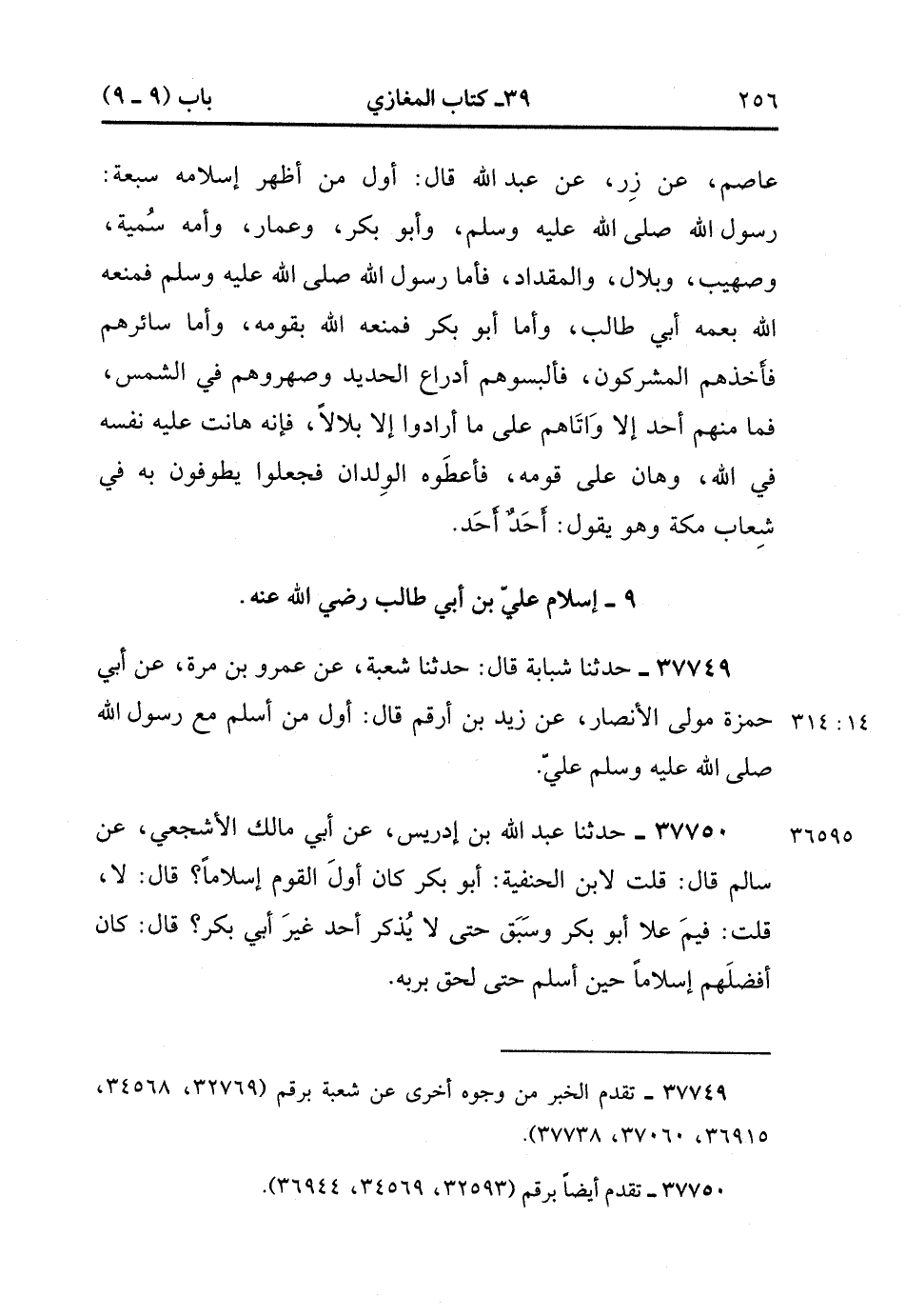 37749- حدَّثَنَا شَبَابَةُ ، قَالَ : حَدَّثَنَا شُعْبَةُ ، عَنْ عَمْرِو بْنِ مُرَّةَ ، عَنْ أَبِي حَمْزَةَ مَوْلَى الأَنْصَارِ ، عَنْ زَيْدِ بْنِ أَرْقَمَ ، قَالَ : أَوَّلُ مَنْ أَسْلَمَ مَعَ رَسُولِ اللهِ صَلَّى الله عَلَيْهِ وَسَلَّمَ عَلِيٌّ. (14/313)