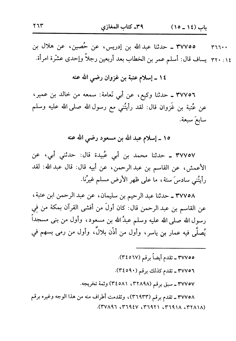 37755- حَدَّثَنَا عَبْدُ بْنُ إِدْرِيسَ ، عَنْ حُصَيْنٍ ، عَنْ هِلاَلِ بْنِ يَِسَاف ، قَالَ : أَسْلَمَ عُمَرُ بْنُ الْخَطَّابِ بَعْدَ أَرْبَعِينَ رَجُلاً ، وَإِحْدَى عَشْرَةَ امْرَأَةً. (14/319)