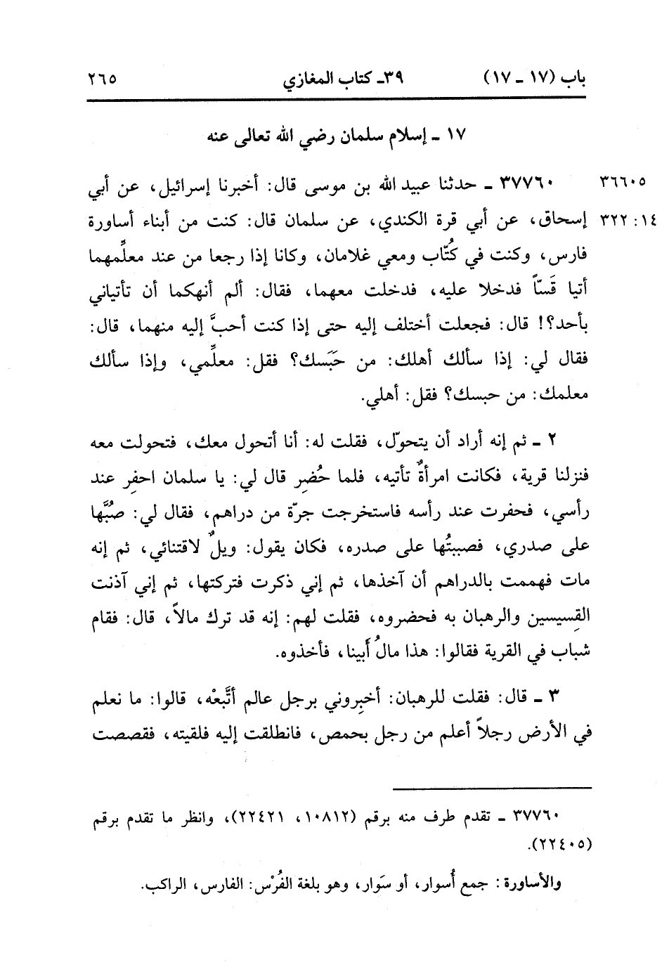 37760- حدَّثَنَا عُبَيْدُ اللهِ بْنُ مُوسَى , قَالَ : أَخْبَرَنَا إِسْرَائِيلُ ، عَنْ أَبِي إِسْحَاقَ ، عَنْ أَبِي قُرَّةَ الْكِنْدِيِّ ، عَنْ سَلْمَانَ ، قَالَ : كُنْتُ مِنْ أَبْنَاءِ أَسَاوِرَةِ فَارِسَ ، وَكُنْتُ فِي كُتَّابٍ وَمَعِي غُلاَمَانِ , وَكَانَا إِذَا رَجَعَا مِنْ عِنْدِ مُعَلِّمِهِمَا أَتَيَا قَسًّا ، فَدَخَلاَ عَلَيْهِ ، فَدَخَلْتُ مَعَهُمَا ، فَقَالَ : أَلَمْ أَنْهَكُمَا أَنْ تَأْتِيَانِي بِأَحَدٍ ؟ قَالَ : فَجَعَلْتُ أَخْتَلِفُ إِلَيْهِ ، حَتَّى إِذَا كُنْتُ أَحَبَّ إِلَيْهِ مِنْهُمَا ، قَالَ : فَقَالَ لِي : إِذَا سَأَلَكَ أَهْلُكَ : مَنْ حَبَسَكَ ؟ فَقُلْ : مُعَلِّمِي , وَإِذَا سَأَلَكَ مُعَلِّمُكَ : مَنْ حَبَسَكَ ؟ فَقُلْ : أَهْلِي.