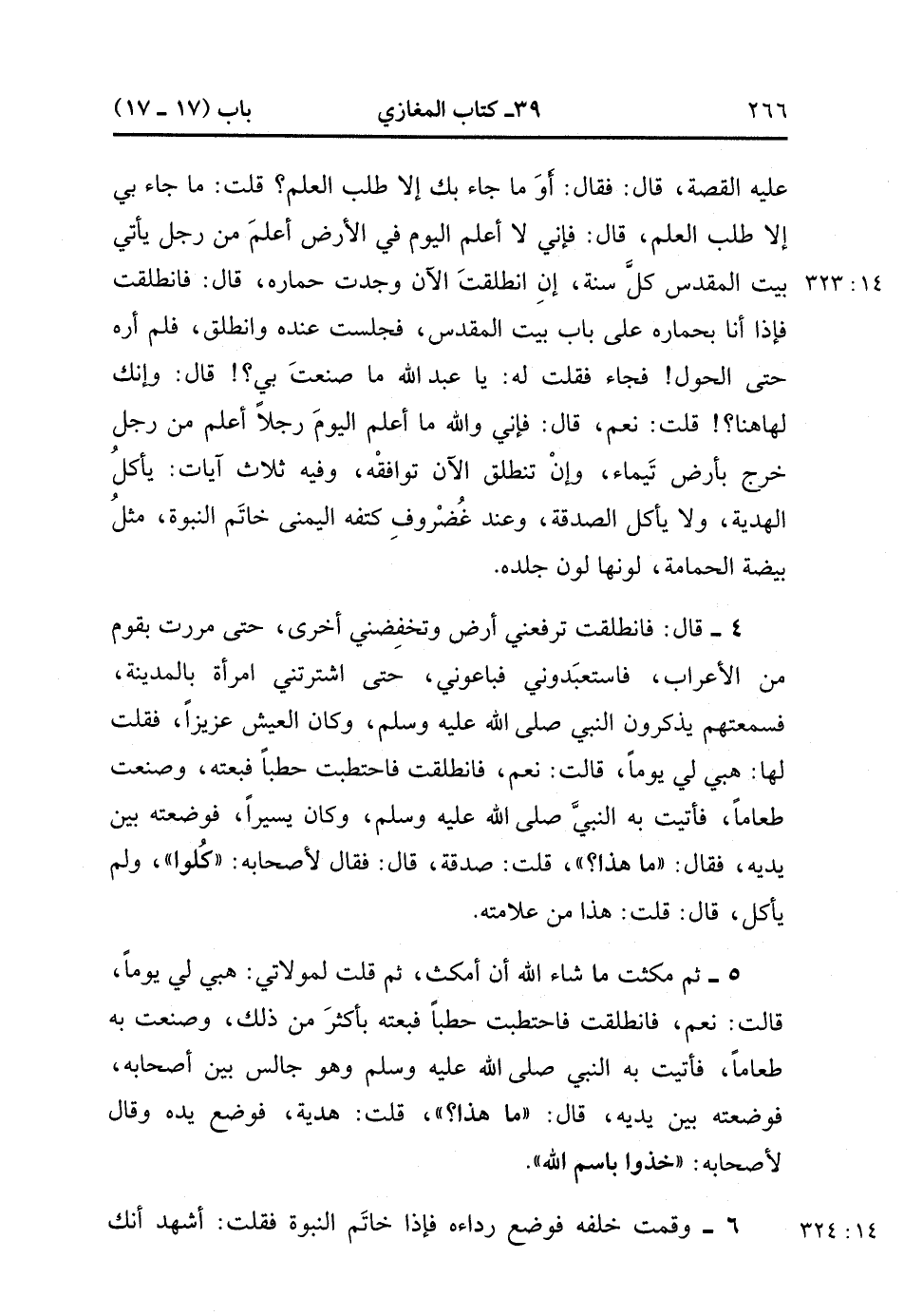 وَقُمْتُ خَلْفَهُ , فَوَضَعَ رِدَاءَهُ ، فَإِذَا خَاتَِمُ النُّبُوَّةِ ، فَقُلْتُ : أَشْهَدُ أَنَّك رَسُولُ اللهِ ، قَالَ : وَمَا ذَاكَ ؟ فَحَدَّثْتُهُ عَنِ الرَّجُلِ ، ثُمَّ قُلْتُ : أَيَدْخُلُ الْجَنَّةَ يَا رَسُولَ اللهِ ؟ فَإِنَّهُ حَدَّثَنِي أَنَّك نَبِيٌّ ، قَالَ : لَنْ يَدْخُلَ الْجَنَّةَ إِلاَّ نَفْسٌ مُسْلِمَةٌ. (14/323).