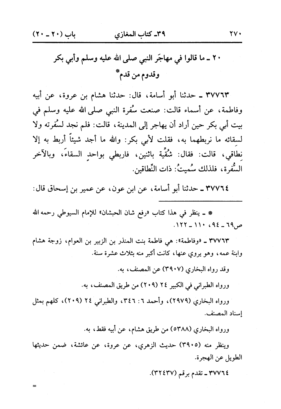 37763- حَدَّثَنَا أَبُو أُسَامَةَ ، قَالَ : حَدَّثَنَا هِشَامُ بْنُ عُرْوَةَ ، عَنْ أَبِيهِ ، وَفَاطِمَةُ ، عَنْ أَسْمَاءَ ، قَالَتْ : صَنَعْتُ سُفْرَةَ النَّبِيِّ صَلَّى الله عَلَيْهِ وَسَلَّمَ فِي بَيْتِ أَبِي بَكْرٍ ، حِيْنَ أَرَادَ أَنْ يُهَاجِرَ إِلَى الْمَدِينَةِ ، قَالَتْ : فَلَمْ نَجِدْ لِسُفْرَتِهِ ، وَلاَ لِسِقَائِهِ مَا نَرْبِطُهُمَا بِهِ ، فَقُلْتُ لأَبِي بَكْرٍ : وَاللهِ مَا أَجِدُ شَيْئًا أَرْبِطُ بِهِ إِلاَّ نِطَاقِي ، قَالَتْ : فَقَالَ : شُقِّيهِ بِاثْنَيْنِ ، فَارْبِطِي بِوَاحِدٍ السِّقَاءَ ، وَبِالآخَرِ السُّفْرَةَ ، فَلِذَلِكَ سُمِّيتُ ذَاتَ النِّطَاقَيْنِ. (14/326).