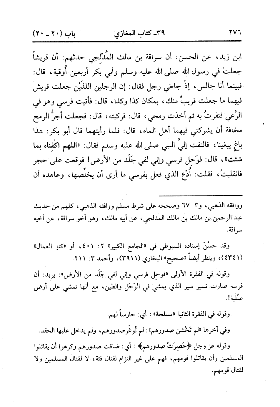 37767- حَدَّثَنَا أَسْوَدُ بْنُ عَامِرٍ , قَالَ : حدَّثَنَا حَمَّادُ بْنُ سَلَمَةَ ، عَنْ عَلِيِّ بْنِ زَيْدٍ ، عَنِ الْحَسَنِ ، أَنَّ سُرَاقَةَ بْنِ مَالِكٍ الْمُدْلِجِيِّ ، حَدَّثَهُمْ ؛ أَنَّ قُرَيْشًا جَعَلَتْ فِي رَسُولِ اللهِ صَلَّى الله عَلَيْهِ وَسَلَّمَ وَأَبِي بَكْرٍ أَرْبَعِينَ أُوقِيَّةً ، قَالَ : فَبَيْنَمَا أَنَا جَالِسٌ إِذْ جَاءَنِي رَجُلٌ ، فَقَالَ : إِنَّ الرَّجُلَيْنِ الَّذَيْنِ جَعَلَتْ قُرَيْشٌ فِيهِمَا مَا جَعَلَتْ قَرِيبٌ مِنْكَ ، بِمَكَانِ كَذَا وَكَذَا , قَالَ : فَأَتَيْتُ فَرَسِي ، وَهُوَ فِي الرَّعْيِّ ، فَنَفَرْتُ بِهِ ، ثُمَّ أَخَذْتُ رُمْحِي ، قَالَ : فَرَكِبْتُهُ ، قَالَ : فَجَعَلْتُ أَجُرُّ الرُّمْحَ مَخَافَةَ أَنْ يُشْرِكَنِي فِيهِمَا أَهْلُ الْمَاءِ ، قَالَ : فَلَمَّا رَأَيْتُهُمَا ، قَالَ أَبُو بَكْرٍ : هَذَا بَاغٍ يَبْغِينَا , فَالْتَفَتَ إِلَيَّ النَّبِيُّ صَلَّى الله عَلَيْهِ وَسَلَّمَ ، فَقَالَ : اللَّهُمَّ اكْفِنَاهُ بِمَا شِئْتَ ، قَالَ : فَوَحِلَ فَرَسِي ، وَإِنِّي لَفِي جَلَدٍ مِنَ الأَرْضِ , فَوَقَعْتُ عَلَى حَجَرٍ ، فَانْقَلَبْتُ ، فَقُلْتُ : ادْعُ الَّذِي فَعَلَ بِفَرَسِي مَا أَرَى أَنْ يُخَلِّصَهَا , وَعَاهَدَهُ أَنْ لاَ يَعْصِيَهُ ، قَالَ : فَدَعَا لَهُ , فَخَلَّصَ الْفَرَسَ ، فَقَالَ رَسُولُ اللهِ صَلَّى الله عَلَيْهِ وَسَلَّمَ : أَوَاهِبُهُ أَنْتَ لِي ؟ فَقُلْتُ : نَعَمْ ، فَقَالَ : فَهَاهُنَا ، قَالَ : فَعَمِّ عَنَّا النَّاسَ.