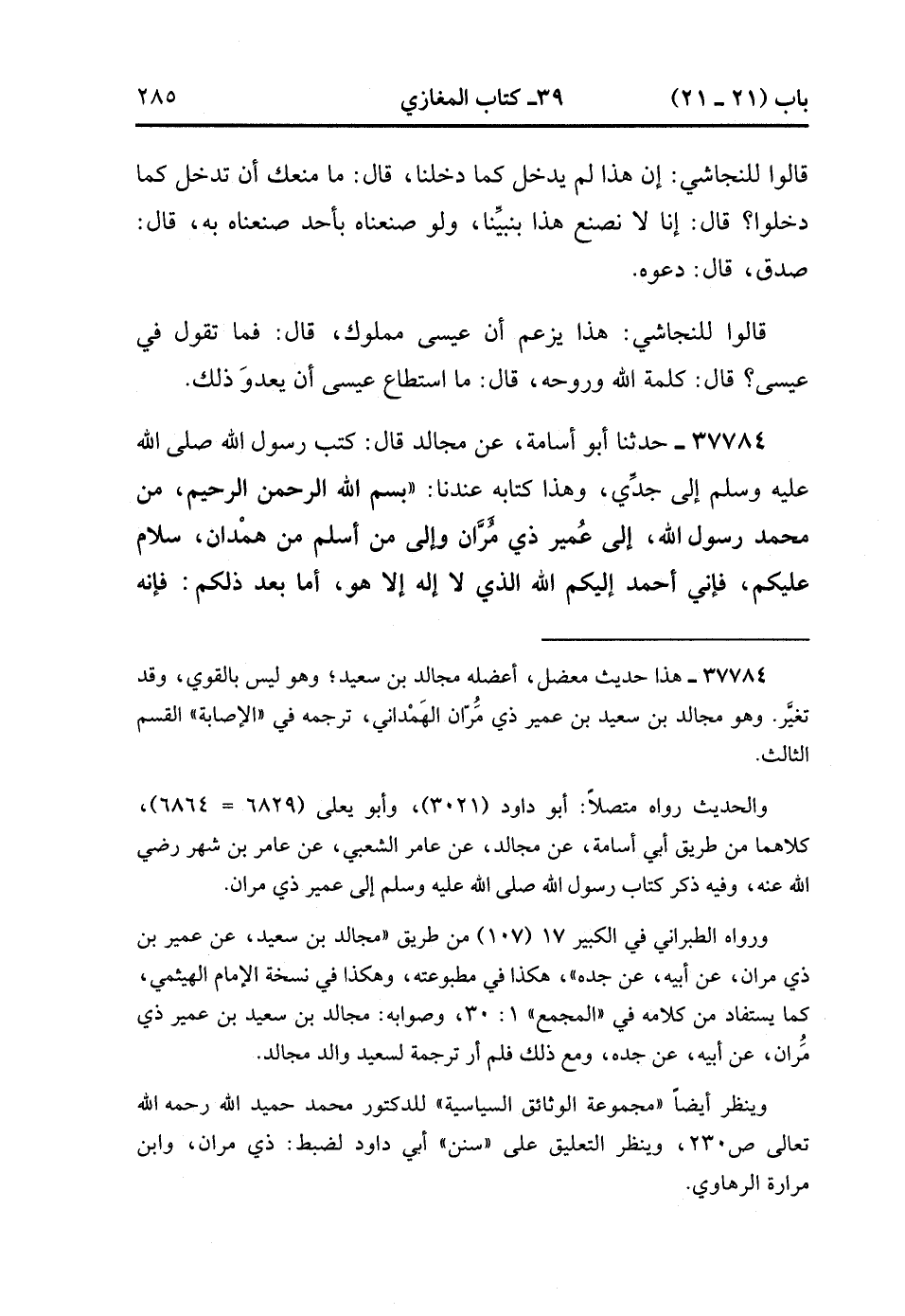 37784- حَدَّثَنَا أَبُو أُسَامَةَ ، عَنْ مُجَالِدٍ ، قَالَ : كَتَبَ رَسُولُ اللهِ صَلَّى الله عَلَيْهِ وَسَلَّمَ إِلَى جَدِّي ، وَهَذَا كِتَابُهُ عِنْدَنَا : بِسْمِ اللهِ الرَّحْمَنِ الرَّحِيمِ ، مِنْ مُحَمَّدٍ رَسُولِ اللهِ صَلَّى الله عَلَيْهِ وَسَلَّمَ إِلَى عُمَيْرِ ذِي مُرَّانَ ، وَإِلَى مَنْ أَسْلَمَ مِنْ هَمْدَانَ ، سَلاَمٌ عَلَيْكُمْ ، فَإِنِّي أَحْمَدُ إِلَيْكُمُ اللَّهَ الَّذِي لاَ إلَهَ إلاَّ هُوَ ، أَمَّا بَعْدُ ذَلِكُمْ ، فَإِنَّهُ بَلَغَنَا إِسْلاَمُكُمْ مَرْجِعَنَا مِنْ أَرْضِ الرُّومِ ، فَأَبْشِرُوا فَإِنَّ اللَّهَ قَدْ هَدَاكُمْ بِهُدَاهُ ، وَأَنَّكُمْ إِذَا شَهِدْتُمْ أَنْ لاَ إلَهَ إِلاَّ اللَّهُ ، وَأَنَّ مُحَمَّدًا رَسُولُ اللهِ ، وَأَقَمْتُمَ الصَّلاَةَ ، وَآتَيْتُمَ (14/339) الزَّكَاةَ ، فَإِنَّ لَكُمْ ذِمَّةَ اللهِ ، وَذِمَّةَ مُحَمَّدٍ رَسُولِ اللهِ عَلَى دِمَائِكُمْ وَأَمْوَالِكُمْ وَأَرْضِ الْبَوْنِ الَّتِي أَسْلَمْتُمْ عَلَيْهَا ، سَهْلِهَا وَجَبَلِهَا وَعُيُونِهَا وَمَرَاعِيهَا ، غَيْرَ مَظْلُومِينَ ، وَلاَ مُضَيَّقًا عَلَيْكُمْ ، فَإِنَّ الصَّدَقَةَ لاَ تَحِلُّ لِمُحَمَّدٍ وَأَهْلِ بَيْتِهِ ، وَإِنَّمَا هِيَ زَكَاةٌ تُزَكُّونَ بِهَا أَمْوَالَكُمْ لِفُقَرَاءِ الْمُسْلِمِينَ ، وَإِنَّ مَالِكَ بْنَ مُرَارَةَ الرَّهَاوِيَّ حَفِظَ الْغَيْبَ ، وَبَلَّغَ الْخَبَرَ ، وَآمُرُك بِهِ يَا ذَا مُرَّانَ خَيْرًا ، فَإِنَّهُ مَنْظُورٌ إِلَيْهِ . وَكَتَبَ عَلِيُّ بْنُ أَبِي طَالِبٍ : وَالسَّلاَمُ عَلَيْكُمْ ، وَلَيُحْيِّيَكُمْ رَبُّكُمْ. (14/340).