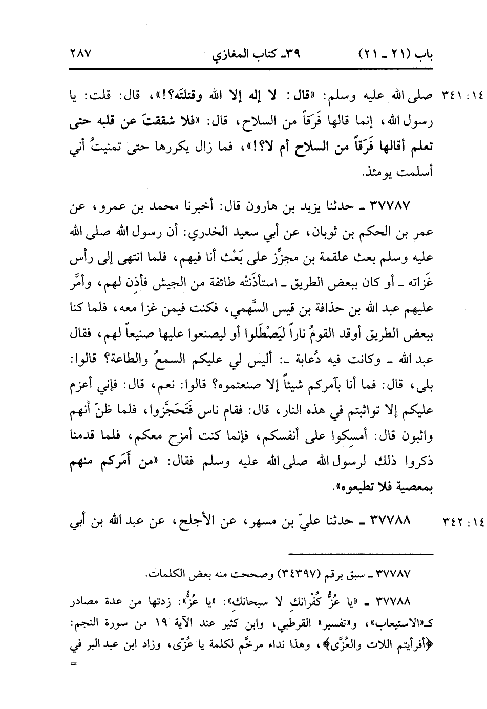 37787- حَدَّثَنَا يَزِيدُ بْنُ هَارُونَ , قَالَ : أَخْبَرَنَا مُحَمَّدُ بْنُ عَمْرٍو ، عَنْ عُمَرَ بْنِ الْحَكَمِ بْنِ ثَوْبَانَ ، عَنْ أَبِي سَعِيدٍ الْخُدْرِيِّ ؛ أَنَّ رَسُولَ اللهِ صَلَّى الله عَلَيْهِ وَسَلَّمَ بَعَثَ عَلْقَمَةَ بْنَ مُحْرِزٍ عَلَى بَعْثٍ أَنَا فِيهِمْ ، فَلَمَّا انْتَهَى إِلَى رَأْسِ غُزَاتِهِ ، أَوْ كَانَ بِبَعْضِ الطَّرِيقِ ، اسْتَأْذَنَتْهُ طَائِفَةٌ مِنَ الْجَيْشِ فَأَذِنَ لَهُمْ ، وَأَمَّرَ عَلَيْهِمْ عَبْدَ اللهِ بْنَ حُذَافَةَ بْنِ قَيْسٍ السَّهْمِي ، فَكُنْتُ فِيمَنْ غَزَا مَعَهُ ، فَلَمَّا كُنَّا بِبَعْضِ الطَّرِيقِ أَوْقَدَ الْقَوْمُ نَارًا لِيَصْطَلُوا ، أَوْ لِيَصْنَعُوا عَلَيْهَا صَنِيعًا لَهُمْ ، فَقَالَ عَبْدُ اللهِ ، وَكَانَتْ فِيهِ دُعَابَةٌ : أَلَيْسَ لِي عَلَيْكُمُ السَّمْعُ وَالطَّاعَةُ ؟ قَالُوا : بَلَى ، قَالَ : فَمَا أَنَا بِآمِرِكُمْ شَيْئًا إِلاَّ صَنَعْتُمُوهُ ؟ قَالُوا : نَعَمْ ، قَالَ : فَإِنِّي أَعْزِمُ عَلَيْكُمْ إِلاَّ تَوَاثَبْتُمْ فِي هَذِهِ النَّارِ ، قَالَ : فَقَامَ نَاسٌ فَتَحَجَّزُوا ، فَلَمَّا ظَنَّ أَنَّهُمْ وَاثِبُونَ ، قَالَ : أَمْسِكُوا عَلَى أَنْفُسِكُمْ ، فَإِنَّمَا كُنْتُ أَمْزَحُ مَعَكُمْ ، فَلَمَّا قَدِمْنَا ذَكَرُوا ذَلِكَ لِرَسُولِ اللهِ صَلَّى الله عَلَيْهِ وَسَلَّمَ ، فَقَالَ : مَنْ أَمَرَكُمْ مِنْهُمْ بِمَعْصِيَةٍ ، فَلاَ تُطِيعُوهُ. (14/341).