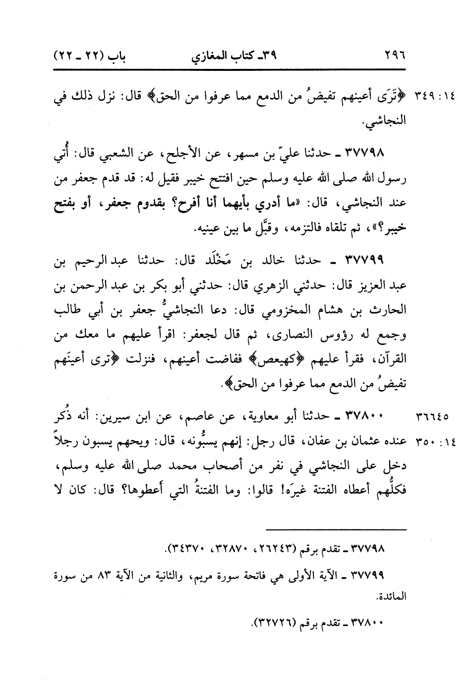 37799- حَدَّثَنَا خَالِدُ بْنُ مَخْلَدٍ , قَالَ : حدَّثَنَا عَبْدُ الرَّحِيمِ بْنُ عَبْدِ الْعَزِيزِ ، قَالَ : حَدَّثَنِي الزُّهْرِيُّ ، قَالَ : حَدَّثَنِي أَبُو بَكْرِ بْنُ عَبْدِ الرَّحْمَنِ بْنِ الْحَارِثِ بْنِ هِشَامٍ الْمَخْزُومِيُّ ، قَالَ : دَعَا النَّجَاشِيُّ جَعْفَرَ بْنَ أَبِي طَالِبٍ ، وَجَمَعَ لَهُ رُؤُوسَ النَّصَارَى ، ثُمَّ قَالَ لِجَعْفَرٍ : اقْرَأْ عَلَيْهِمْ مَا مَعَكَ مِنَ الْقُرْآنِ ، فَقَرَأَ عَلَيْهِمْ {كهيعص} فَفَاضَتْ أَعْيُنُهُمْ ، فَنَزَلَتْ : {تَرَى أَعْيُنَهُمْ تَفِيضُ مِنَ الدَّمْعِ مِمَّا عَرَفُوا مِنَ الْحَقِّ}. (14/349)