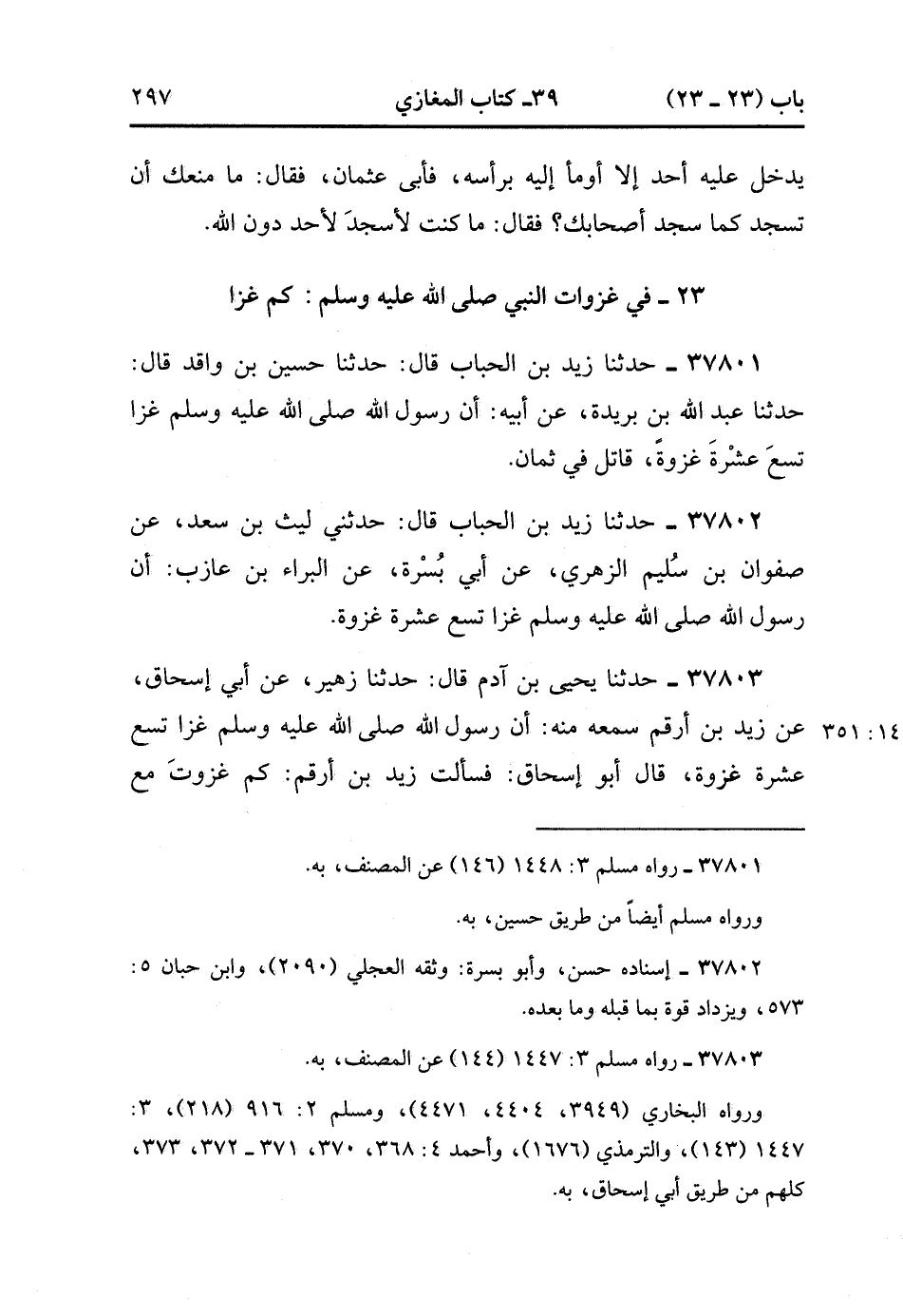 37803- حَدَّثَنَا يَحْيَى بْنُ آدَمَ , قَالَ : حدَّثَنَا زُهَيْرٍ ، عَنْ أَبِي إِسْحَاقَ ، عَنْ زَيْدِ بْنِ أَرْقَمَ ، سَمِعَهُ مِنْهُ ؛ أَنَّ رَسُولَ اللهِ صَلَّى الله عَلَيْهِ وَسَلَّمَ غَزَا تِسْعَ عَشْرَةَ غَزْوَةً ، قَالَ أَبُو إِسْحَاقَ : فَسَأَلْتُ زَيْدَ بْنَ أَرْقَمَ : كَمْ غَزَوْتَ مَعَ رَسُولِ اللهِ صَلَّى الله عَلَيْهِ وَسَلَّمَ ؟ قَالَ : سَبْعَ عَشْرَةَ. (14/350).