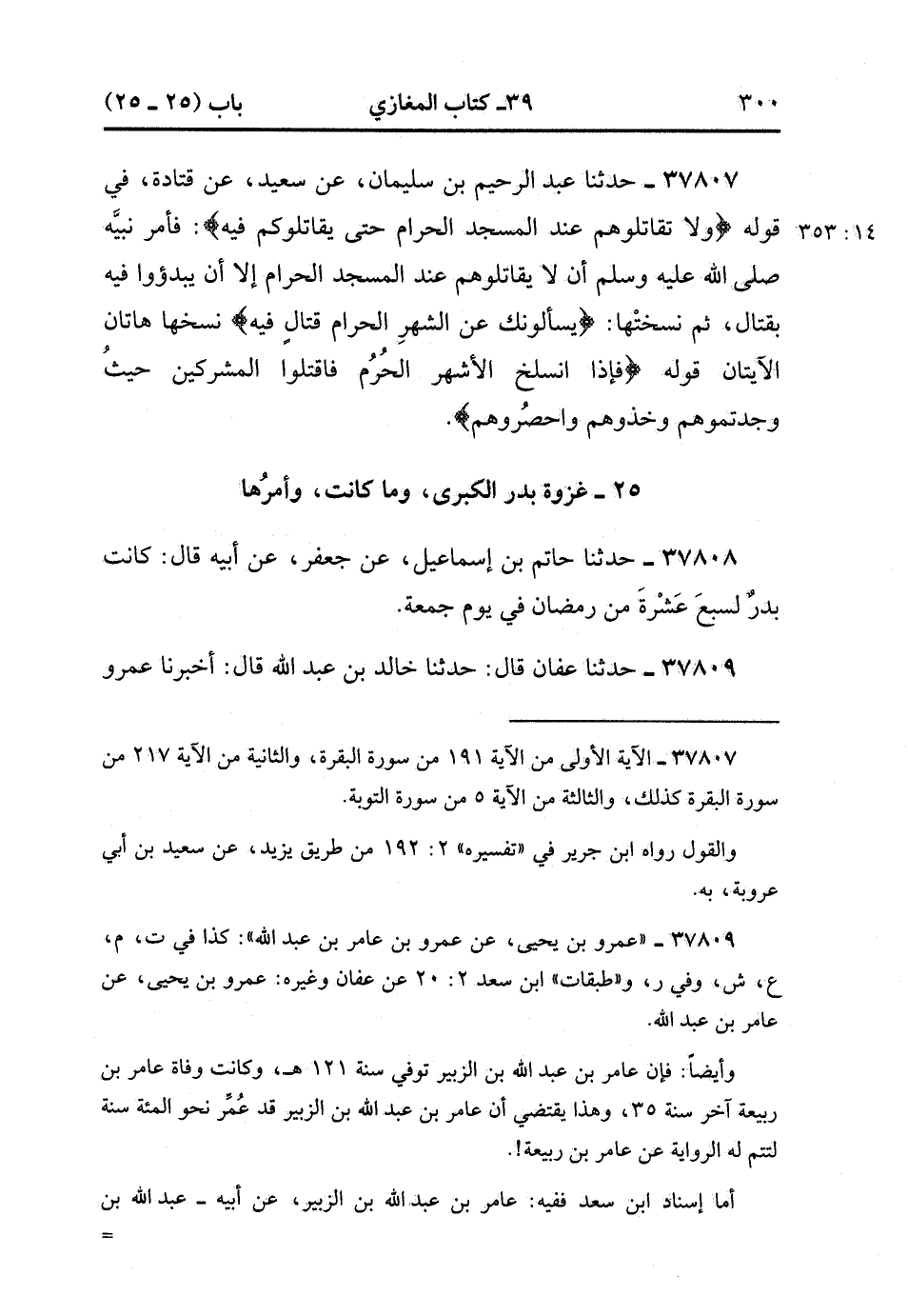 37807- حَدَّثَنَا عَبْدُ الرَّحِيمِ بْنُ سُلَيْمَانَ ، عَنْ سَعِيدٍ ، عَنْ قَتَادَةَ ؛ فِي قَوْلِهِ : {وَلاَ تُقَاتِلُوهُمْ عِنْدَ الْمَسْجِدِ الْحَرَامِ حَتَّى يُقَاتِلُوكُمْ فِيهِ} فَأَمَرَ نَبِيَّهُ صَلَّى الله عَلَيْهِ وَسَلَّمَ أَنْ لاَ يُقَاتِلُوهُمْ عِنْدَ الْمَسْجِدِ الْحَرَامِ ، إلاَّ أَنْ يَبْدَؤُوا فِيهِ بِقِتَالٍ ، ثُمَّ نَسَخَتْهَا : {يَسْأَلُونَك عَنِ الشَّهْرِ الْحَرَامِ قِتَالٍ فِيهِ} نَسَخَهَا هَاتَانِ الآيَتَانِ ؛ قَوْلُهُ : {فَإِذَا انْسَلَخَ الأَشْهُرُ الْحُرُمُ فَاقْتُلُوا الْمُشْرِكِينَ حَيْثُ وَجَدْتُمُوهُمْ ، وَخُذُوهُمْ وَاحْصُرُوهُمْ}.