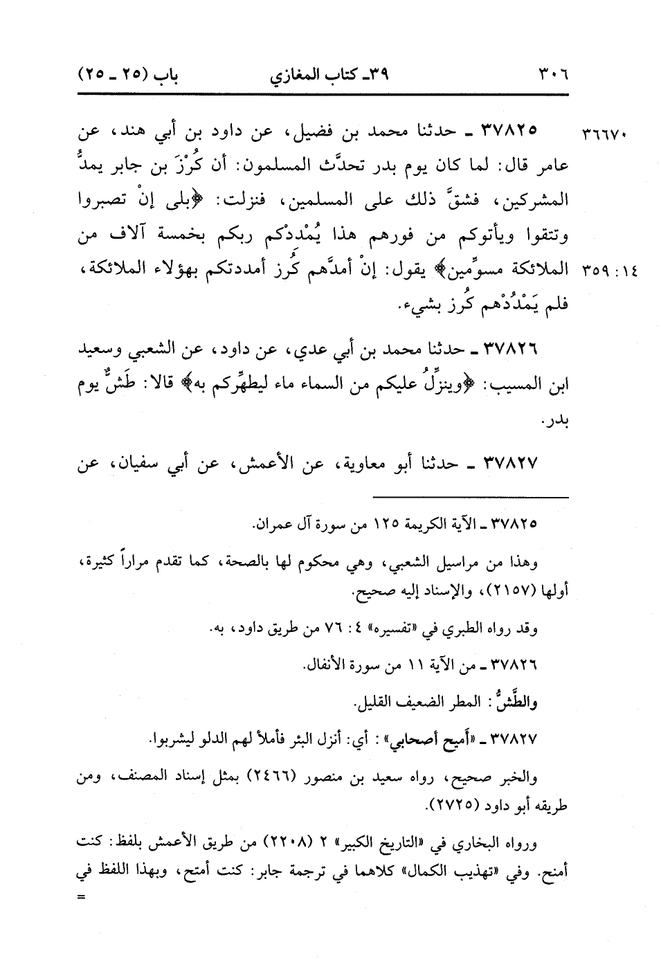 37825- حَدَّثَنَا مُحَمَّدُ بْنُ فُضَيْلٍ ، عَنْ دَاوُدَ بْنِ أَبِي هِنْدٍ ، عَنْ عَامِرٍ ، قَالَ : لَمَّا كَانَ يَوْمُ بَدْرٍ تَحَدَّثَ الْمُسْلِمُونَ أَنَّ كُرْزَ بْنَ جَابِرٍ يُمِدُّ الْمُشْرِكِينَ ، فَشَقَّ ذَلِكَ عَلَى الْمُسْلِمِينَ ، فَنَزَلَتْ : {بَلَى إِنْ تَصْبِرُوا وَتَتَّقُوا وَيَأْتُوكُمْ مِنْ فَوْرِهِمْ هَذَا ، يُمْدِدْكُمْ رَبُّكُمْ بِخَمْسَةِ آلاَفٍ مِنَ الْمَلاَئِكَةِ مُسَوِّمِينَ} يَقُولُ : إِنْ أَمَدَّهُمْ كُرْزٌ أَمَدَدْتُكُمْ بِهَؤُلاَءِ الْمَلاَئِكَةِ ، فَلَمْ يُمْدِدْهُمْ كُرْزٌ بِشَيْءٍ. (14/358)