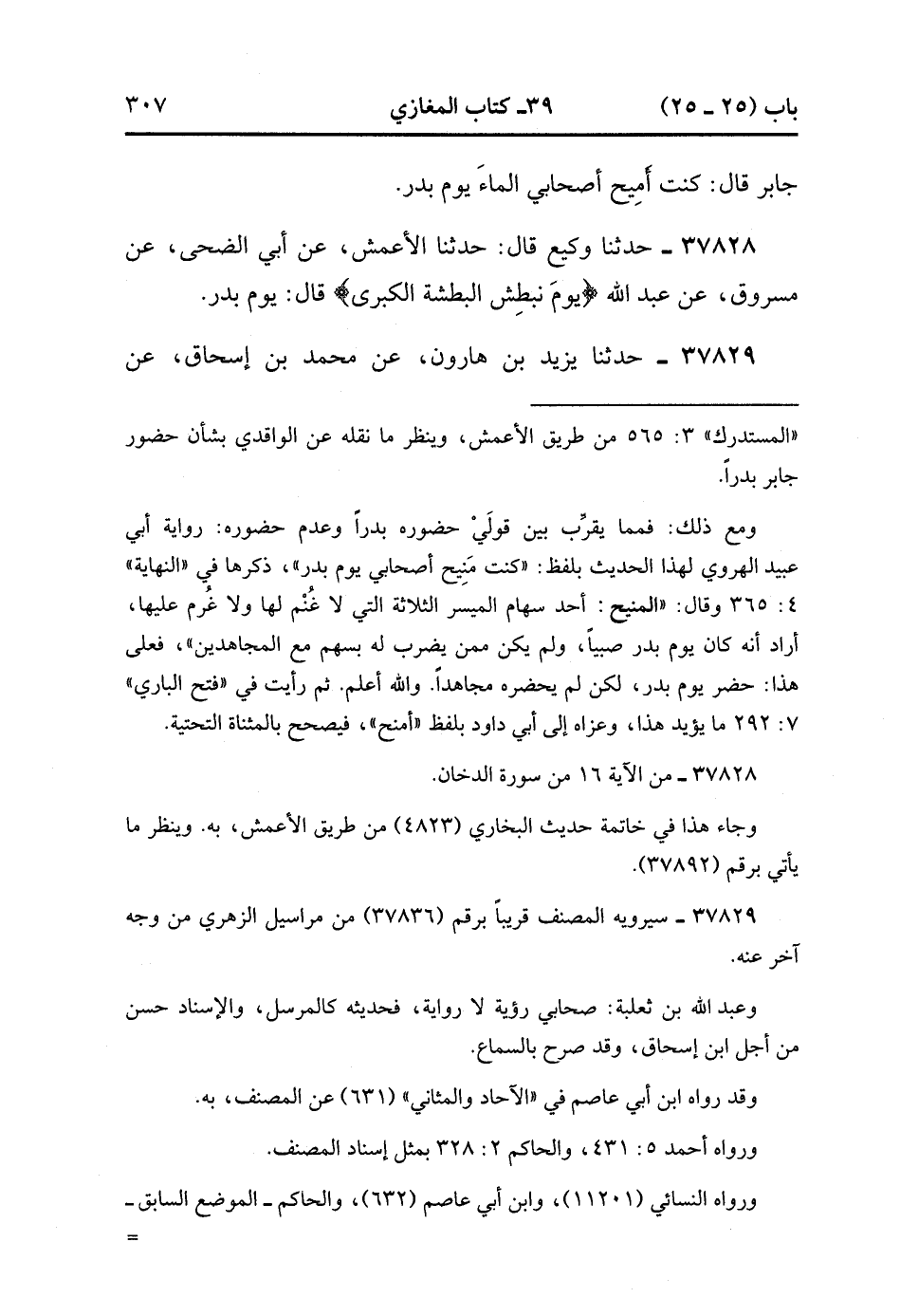 37827- حَدَّثَنَا أَبُو مُعَاوِيَةَ ، عَنِ الأَعْمَشِ ، عَنْ أَبِي سُفْيَانَ ، عَنْ جَابِرٍ ، قَالَ : كُنْتُ أَمَيحُ أَصْحَابِي الْمَاءَ يَوْمَ بَدْرٍ.