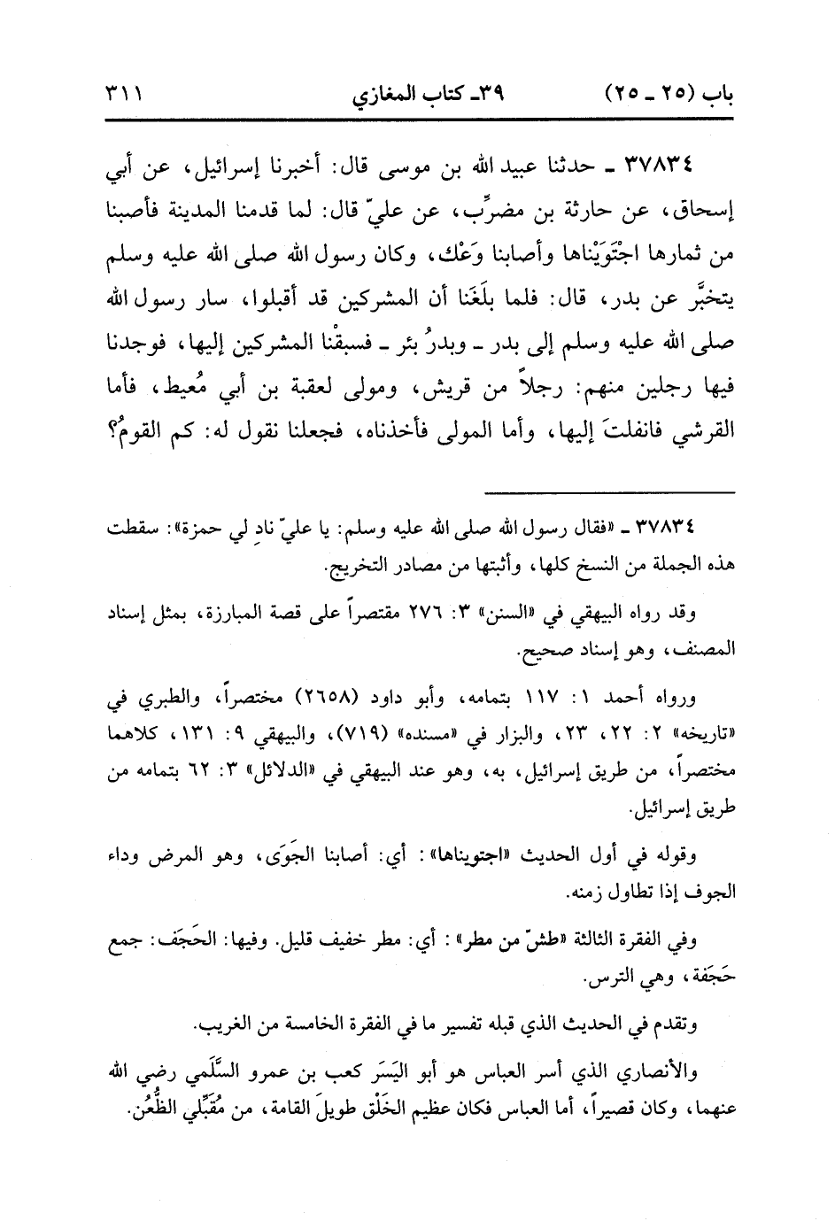 37834- حَدَّثَنَا عُبَيْدُ اللهِ بْنُ مُوسَى , قَالَ : أَخْبَرَنَا إِسْرَائِيلُ ، عَنْ أَبِي إِسْحَاقَ ، عَنْ حَارِثَةَ بْنِ مُضَرِّبٍ ، عَنْ عَلِيٍّ ، قَالَ : لَمَّا قَدِمْنَا الْمَدِينَةَ ، فَأَصَبْنَا مِنْ ثِمَارِهَا اجْتَوَيْنَاهَا وَأَصَابَنَا وَعْكٌ ، وَكَانَ رَسُولُ اللهِ صَلَّى الله عَلَيْهِ وَسَلَّمَ يَتَخَبَّرُ عَنْ بَدْرٍ ، قَالَ : فَلَمَّا بَلَغَنَا أَنَّ الْمُشْرِكِينَ قَدْ أَقْبَلُوا ، سَارَ رَسُولُ اللهِ صَلَّى الله عَلَيْهِ وَسَلَّمَ إِلَى بَدْرٍ ، وَبَدْرُ بِئْرٌ ، فَسَبَقْنَا الْمُشْرِكِينَ إِلَيْهَا ، فَوَجَدْنَا فِيهَا رَجُلَيْنِ مِنْهُمْ ؛ رَجُلاً مِنْ قُرَيْشٍ ، وَمَوْلًى لِعُقْبَةَ بْنِ أَبِي مُعَيْطٍ ، فَأَمَّا الْقُرَشِيُّ فَانْفَلَتَ إِلَيْهَا ، وَأَمَّا الْمَوْلَى فَأَخَذْنَاهُ ، فَجَعَلْنَا نَقُولُ لَهُ : كَمَ الْقَوْمُ ؟ فَيَقُولُ : هُمْ وَاللهِ كَثِيرٌ عَدَدُهُمْ ، شَدِيدٌ بَأْسُهُمْ ، فَجَعَلَ الْمُسْلِمُونَ إِذَا قَالَ ذَاكَ ضَرَبُوهُ ، حَتَّى انْتَهَوْا بِهِ إِلَى رَسُولِ اللهِ صَلَّى الله عَلَيْهِ وَسَلَّمَ ، فَقَالَ لَهُ : كَمَ الْقَوْمُ ؟ فَقَالَ : هُمْ وَاللهِ كَثِيرٌ عَدَدُهُمْ ، شَدِيدٌ بَأْسُهُمْ ، فَجَهَدَ الْقَوْمُ عَلَى (14/362) أَنْ يُخْبِرَهُمْ كَمْ هُمْ ، فَأَبَى.