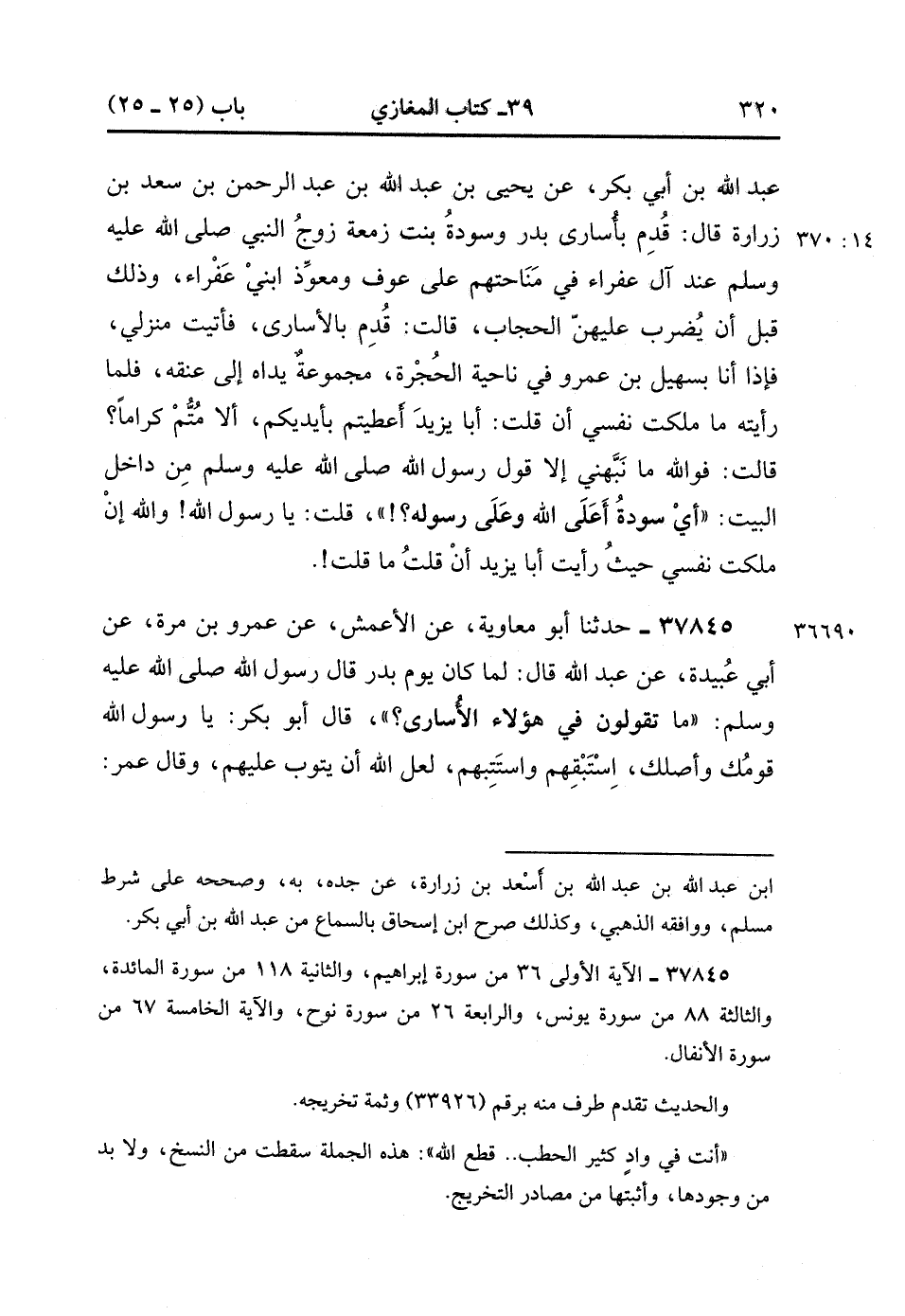37845- حَدَّثَنَا أَبُو مُعَاوِيَةَ ، عَنِ الأَعْمَشِ ، عَنْ عَمْرِو بْنِ مُرَّةَ ، عَنْ أَبِي عُبَيْدَةَ ، عَنْ عَبْدِ اللهِ ، قَالَ : لَمَّا كَانَ يَوْمُ بَدْرٍ ، قَالَ رَسُولُ اللهِ صَلَّى الله عَلَيْهِ وَسَلَّمَ : مَا تَقُولُونَ فِي هَؤُلاَءِ الأُسَارَى ؟ قَالَ أَبُو بَكْرٍ : يَا رَسُولَ اللهِ ، قَوْمُكَ وَأَصْلُكَ ، اسْتَبْقِهِمْ وَاسْتَتِبْهُمْ ، لَعَلَّ اللَّهَ أَنْ يَتُوبَ عَلَيْهِمْ ، وَقَالَ عُمَرُ : يَا رَسُولَ اللهِ ، كَذَّبُوكَ وَأَخْرَجُوكَ ، قَدِّمْهُمْ نَضْرِبْ أعَنَاقَهُمْ ، وَقَالَ عَبْدُ اللهِ بْنُ رَوَاحَةَ : يَا رَسُولَ اللهِ ، أَنْتَ فِي وَادٍ كَثِيرِ الْحَطَبِ ، فَأَضْرِمَ الْوَادِيَ عَلَيْهِمْ نَارًا ، ثُمَّ أَلْقِهِمْ فِيهِ ، فَقَالَ الْعَبَّاسُ : قَطَعَ اللَّهُ رَحِمَكَ ، قَالَ : فَسَكَتَ (14/370) رَسُولُ اللهِ صَلَّى الله عَلَيْهِ وَسَلَّمَ فَلَمْ يَرُدَّ عَلَيْهِمْ ، ثُمَّ قَامَ فَدَخَلَ. (14/371).