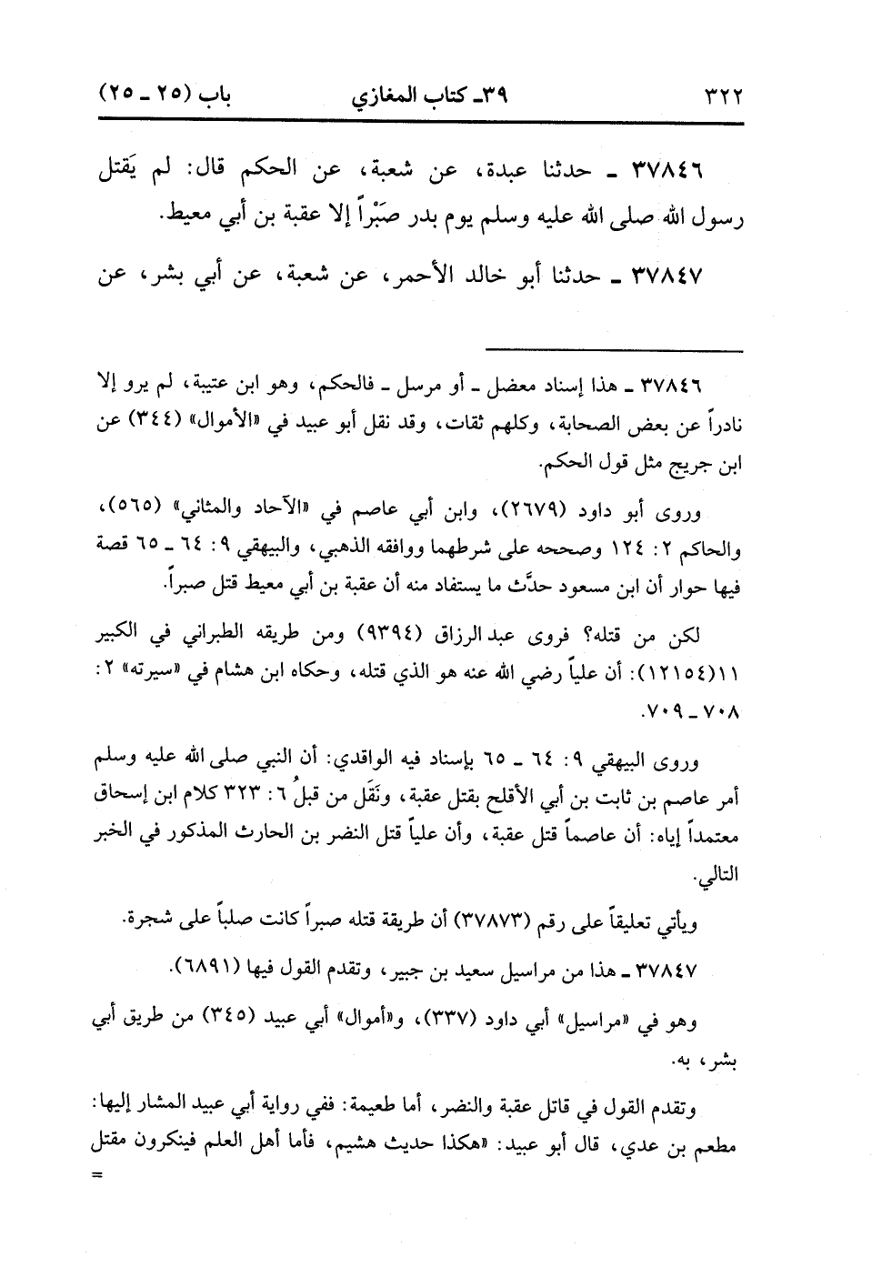 37847- حَدَّثَنَا أَبُو خَالِدٍ الأَحْمَرُ ، عَنْ شُعْبَةَ ، عَنْ أَبِي بِشْرٍ ، عَنْ سَعِيدِ بْنِ جُبَيْرٍ ؛ أَنَّ النَّبِيَّ صَلَّى الله عَلَيْهِ وَسَلَّمَ لَمْ يَقْتُلْ يَوْمَ بَدْرٍ صَبْرًا إِلاَّ ثَلاَثَةً : عُقْبَةَ بْنَ أَبِي مُعَيْطٍ ، وَالنَّضْرَ بْنَ الْحَارِثِ ، وَطُعَيْمَةَ بْنَ عَدِي ، وَكَانَ النَّضْرُ أَسَرَهُ الْمِقْدَادُ. (14/372).