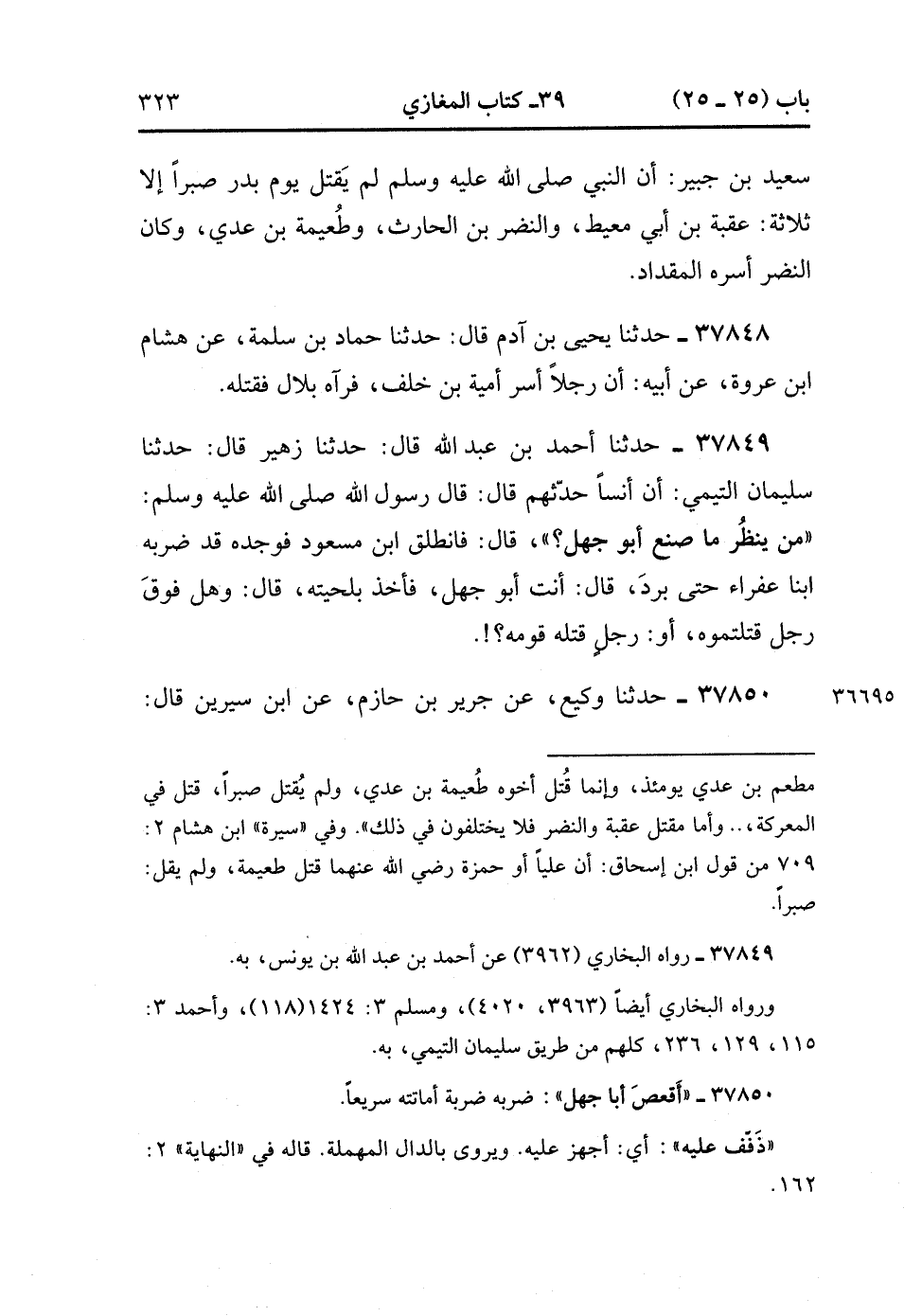 37849- حَدَّثَنَا أَحْمَدُ بْنُ عَبْدِ اللهِ , قَالَ : حدَّثَنَا زُهَيْرٌ ، قَالَ : حَدَّثَنَا سُلَيْمَانُ التَّيْمِيُّ ، أَنَّ أَنَسًا حَدَّثَهُمْ ، قَالَ : قَالَ رَسُولُ اللهِ صَلَّى الله عَلَيْهِ وَسَلَّمَ : مَنْ يَنْظُرُ مَا صَنَعَ أَبُو جَهْلٍ ؟ قَالَ : فَانْطَلَقَ ابْنُ مَسْعُودٍ فَوَجَدَهُ قَدْ ضَرَبَهُ ابْنَا عَفْرَاءَ حَتَّى بَرَدَ ، قَالَ : أَنْتَ أَبُو جَهْلٍ ، فَأَخَذَ بِلِحْيَتِهِ ، قَالَ : وَهَلْ فَوْقَ رَجُلٍ قَتَلْتُمُوهُ ، أَوْ : رَجُلٍ قَتَلَهُ قَوْمُهُ. (14/372)