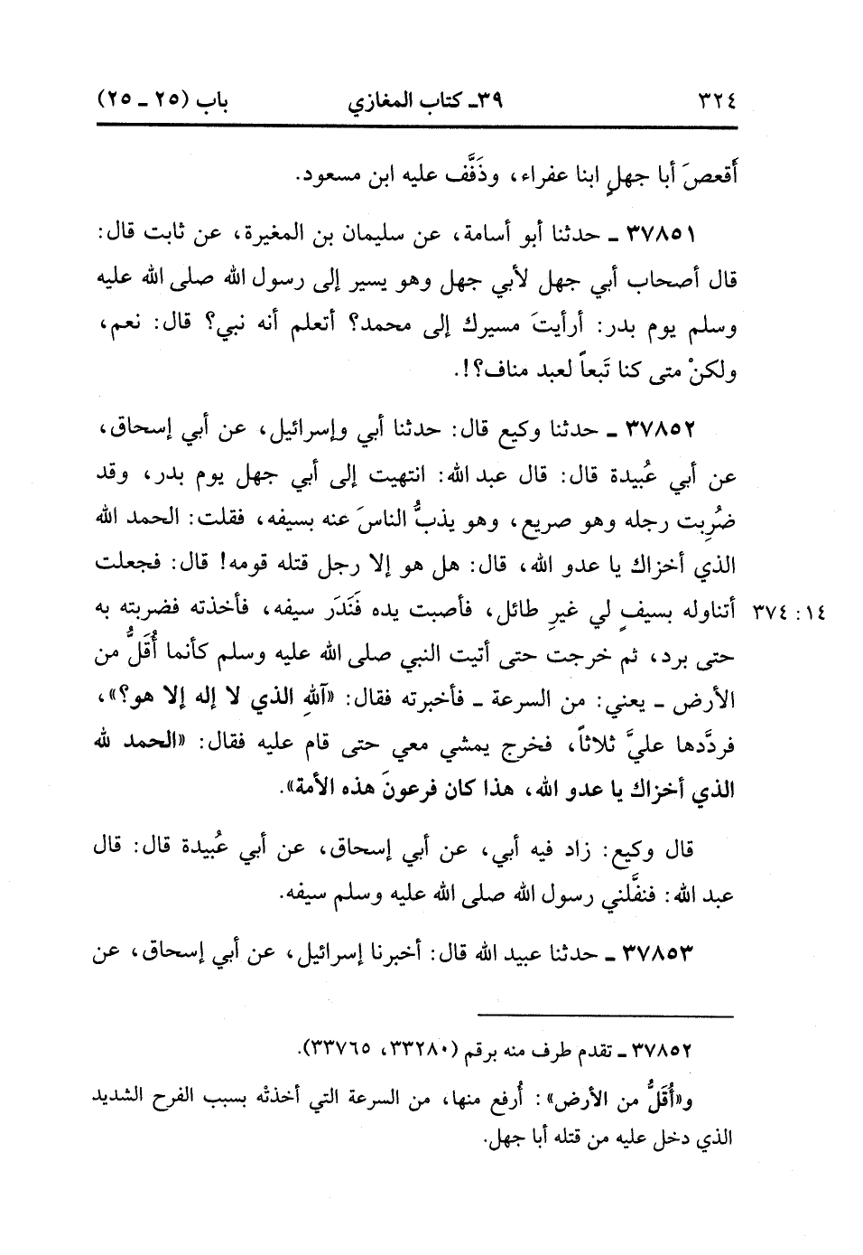 37852- حَدَّثَنَا وَكِيعٌ , قَالَ : حدَّثَنَا أَبِي ، وَإِسْرَائِيلُ ، عَنْ أَبِي إِسْحَاقَ ، عَنْ أَبِي عُبَيْدَةَ ، قَالَ : قَالَ عَبْدُ اللهِ : انْتَهَيْتُ إِلَى أَبِي جَهْلٍ يَوْمَ بَدْرٍ ، وَقَدْ ضُرِبَتْ رِجْلُهُ وَهُوَ صَرِيعٌ ، وَهُوَ يَذُبُّ النَّاسَ عَنْهُ بِسَيْفِهِ ، فَقُلْتُ : الْحَمْدُ لِلَّهِ الَّذِي أَخْزَاكَ يَا عَدُوَّ اللهِ ، قَالَ : هَلْ هُوَ إِلاَّ رَجُلٌ قَتَلَهُ قَوْمُهُ ، قَالَ : فَجَعَلْتُ أَتَنَاوَلُهُ بِسَيْفٍ لِي غَيْرِ (14/373) طَائِلٍ ، فَأَصَبْتُ يَدَهُ ، فَنَدَرَ سَيْفَهُ ، فَأَخَذْتُهُ فَضَرَبْتُهُ بِهِ حَتَّى بَرَدَ ، ثُمَّ خَرَجْتُ حَتَّى أَتَيْتُ النَّبِيَّ صَلَّى الله عَلَيْهِ وَسَلَّمَ كَأَنَّمَا أَقَلُّ مِنَ الأَرْضِ ، يَعْنِي مِنَ السُّرْعَةِ ، فَأَخْبَرْتُهُ ، فَقَالَ : آللَّهِ الَّذِي لاَ إِلَهَ إِلاَّ هُوَ ؟ فَرَدَّدَهَا عَلَيَّ ثَلاَثًا ، فَخَرَجَ يَمْشِي مَعِي حَتَّى قَامَ عَلَيْهِ ، فَقَالَ : الْحَمْدُ لِلَّهِ الَّذِي أَخْزَاكَ يَا عَدُوَّ اللهِ ، هَذَا كَانَ فِرْعَوْنَ هَذِهِ الأُمَّةِ.