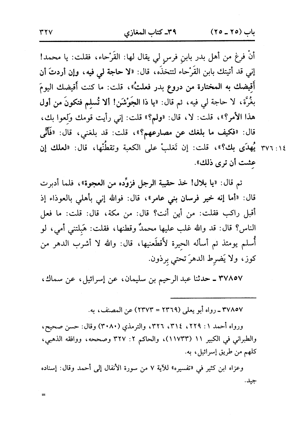 37857- حَدَّثَنَا عَبْدُ الرَّحِيمِ بْنُ سُلَيْمَانَ ، عَنْ إِسْرَائِيلَ ، عَنْ سِمَاكٍ ، عَنْ عِكْرِمَةَ ، عَنِ ابْنِ عَبَّاسٍ ، قَالَ : قيلَ لِرَسُولِ اللهِ صَلَّى الله عَلَيْهِ وَسَلَّمَ حِينَ فَرَغَ مِنْ بَدْرٍ : عَلَيْكَ بِالْعِيرِ لَيْسَ دُونَهَا شَيْءٌ ، فَنَادَاهُ الْعَبَّاسُ وَهُوَ أَسِيرٌ فِي وَثَاقِهِ : لاَ يَصْلحُّ ، فَقَالَ رَسُولُ اللهِ صَلَّى الله عَلَيْهِ وَسَلَّمَ : لِمَهْ ؟ قَالَ : إِنَّ اللَّهَ وَعَدَكَ إِحْدَى الطَّائِفَتَيْنِ ، وَقَدْ أَعْطَاكَ مَا وَعَدَكَ. (14/376).