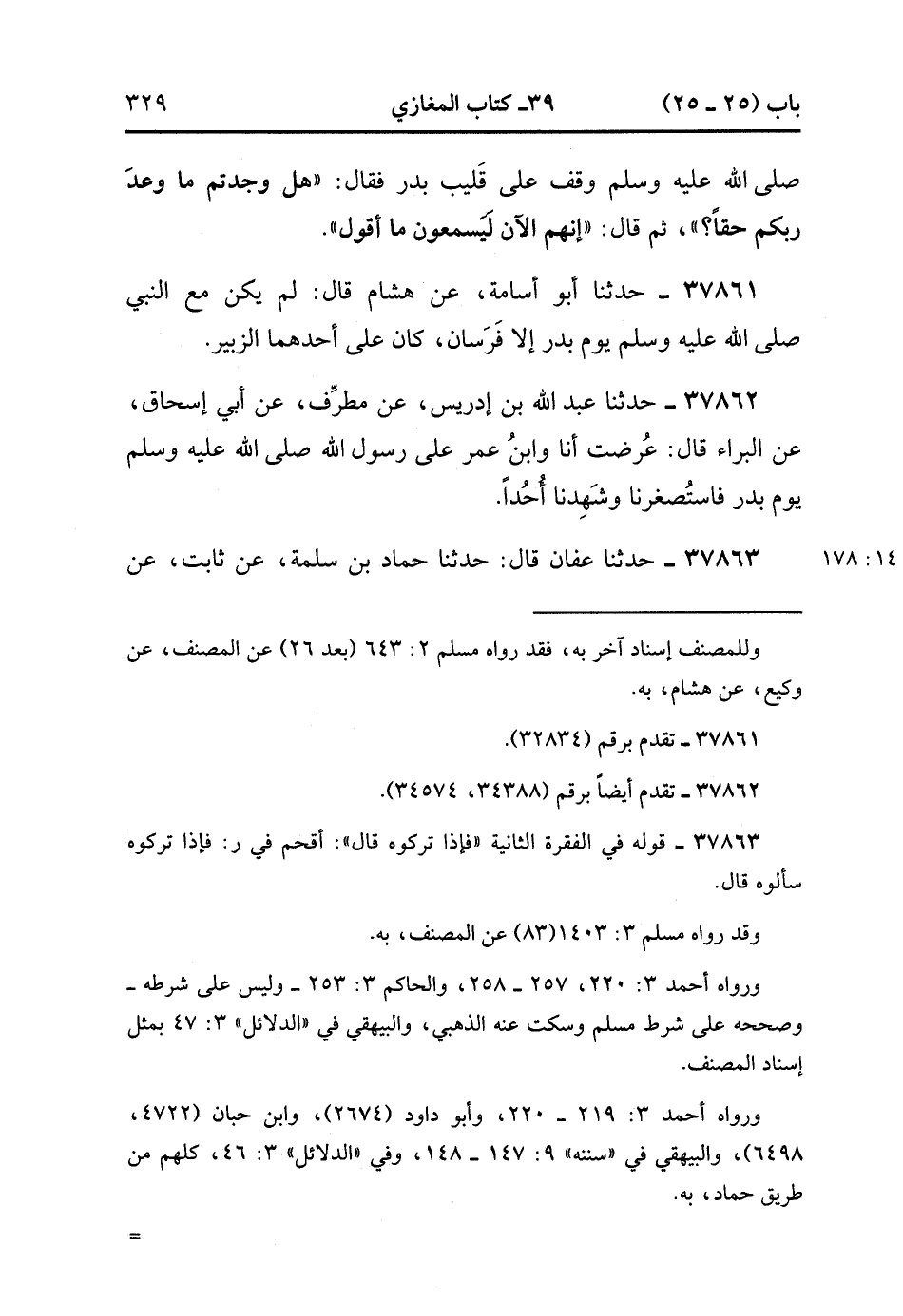 37862- حَدَّثَنَا عَبْدُ اللهِ بْنُ إِدْرِيسَ ، عَنْ مُطَرِّفٍ ، عَنْ أَبِي إِسْحَاقَ ، عَنِ الْبَرَاءِ ، قَالَ : عُرِضْتُ أَنَا ، وَابْنُ عُمَرَ عَلَى رَسُولِ اللهِ صَلَّى الله عَلَيْهِ وَسَلَّمَ يَوْمَ بَدْرٍ فَاسْتُصْغِرْنَا ، وَشَهِدْنَا أُحُدًا. (14/377).
